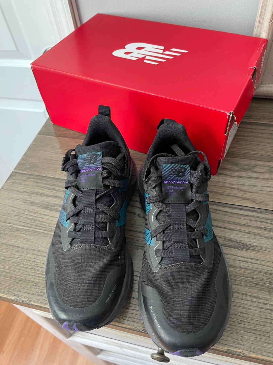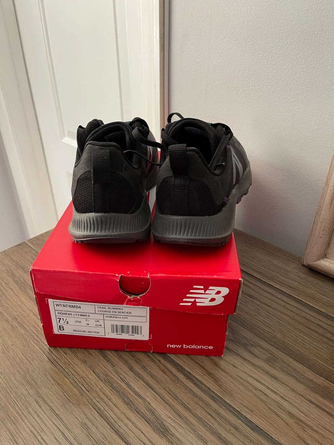 34Women's trail running shoes. Size 7.5. Black with purple accents. . New in box. TRAIL RUNNING COURSE EN SENTIER -NB letters on the sneakers are aqua & purple