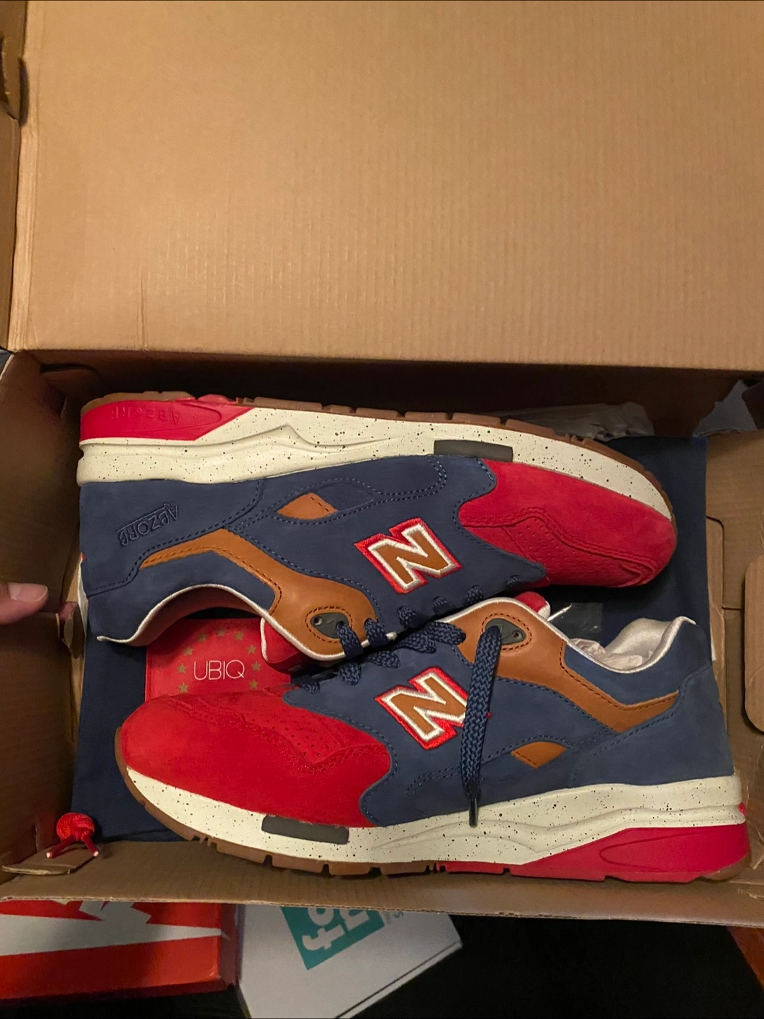 10Selling a pair of New Balance x UBIQ 1600 Project Runner sneakers. These come in a striking red, navy, and brown colourway. The shoes are slightly used but in excellent condition and come with the original box