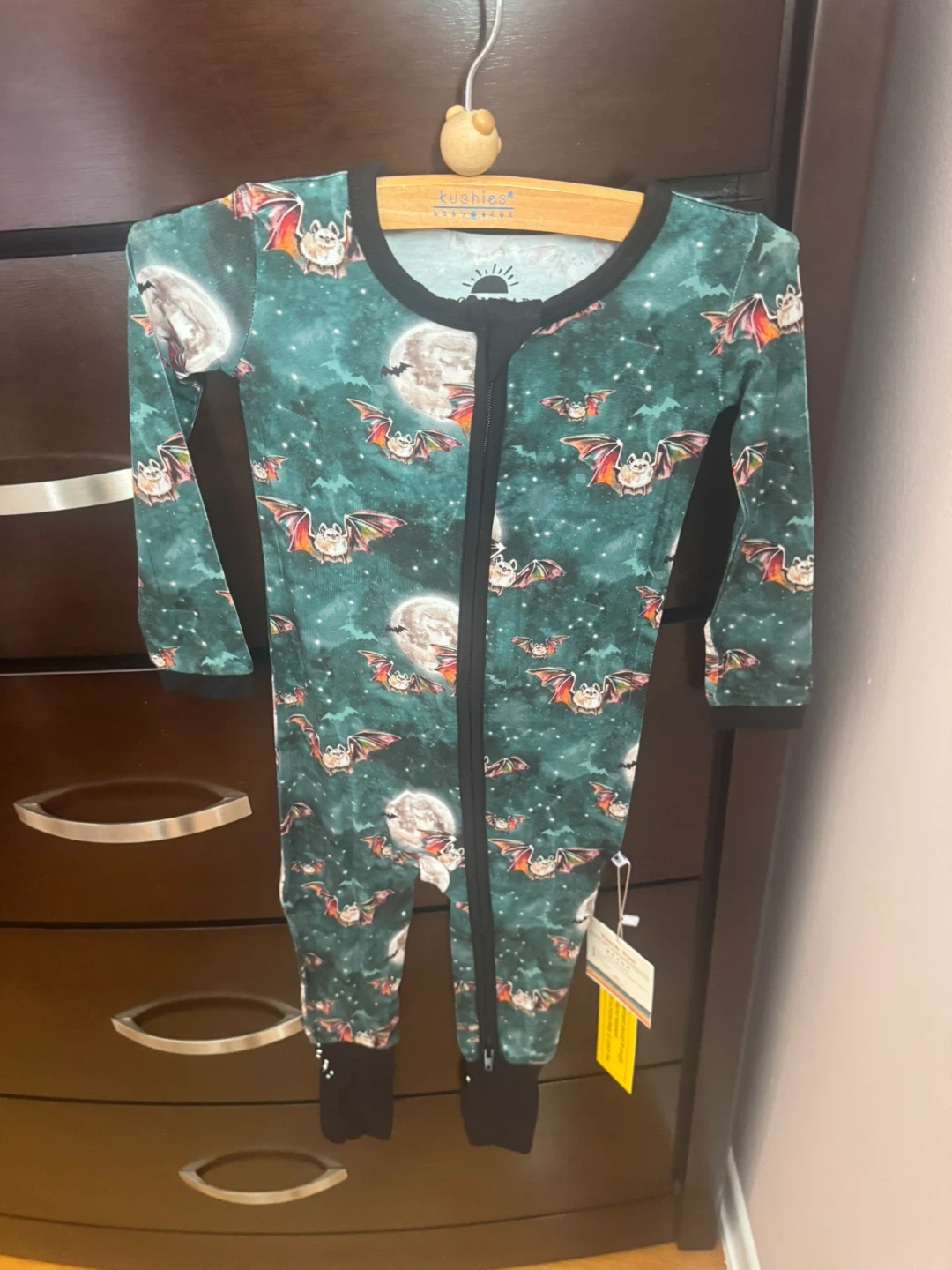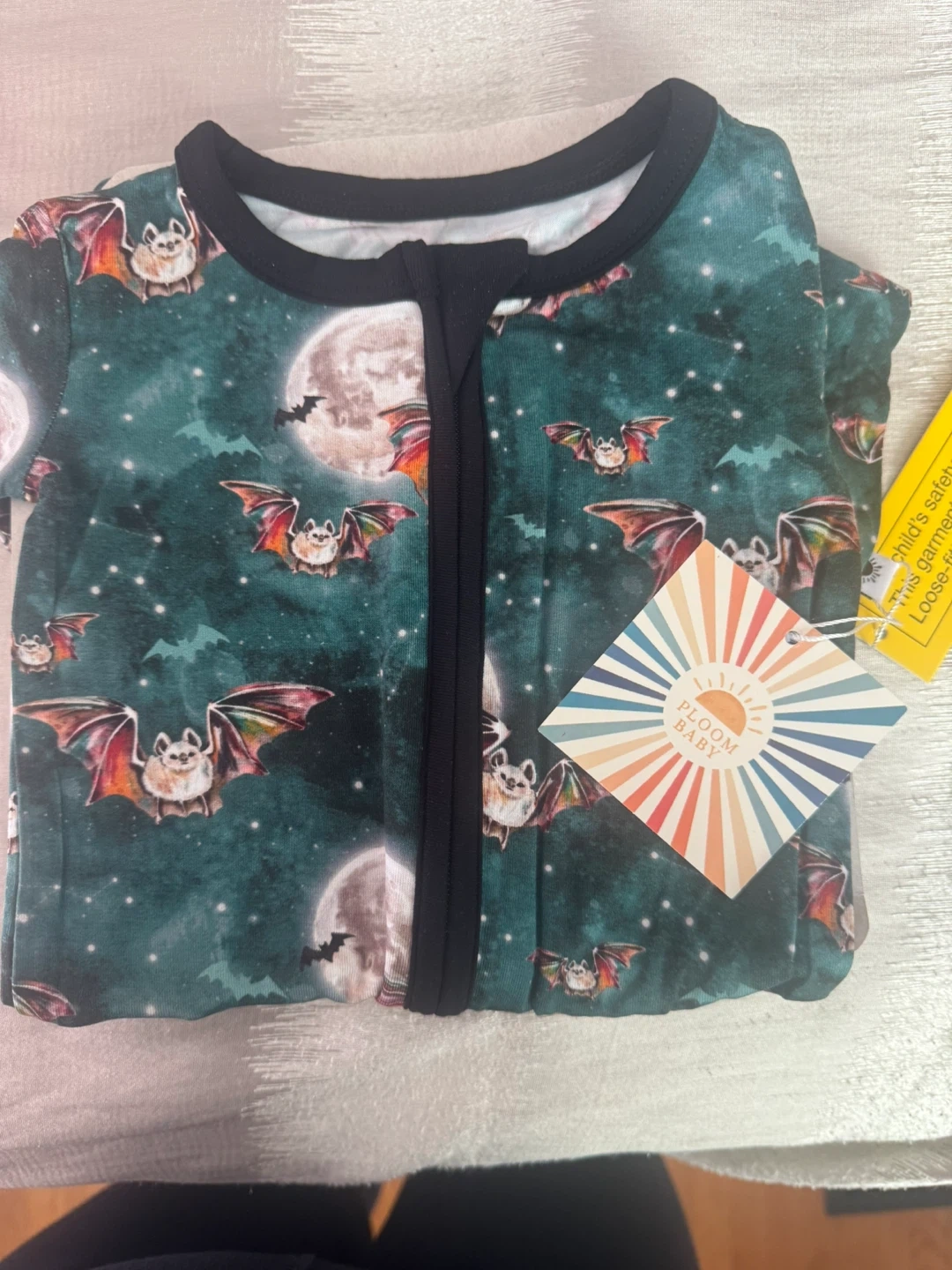 10This Ploom Baby bamboo sleeper is brand new with tags! It features a cute bat and moon print on a green background with black and white polka dot accents. Perfect for your little one's bedtime!