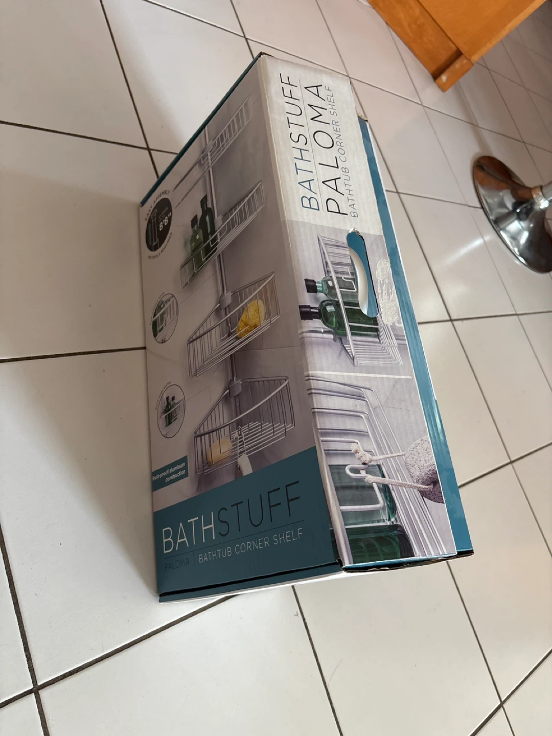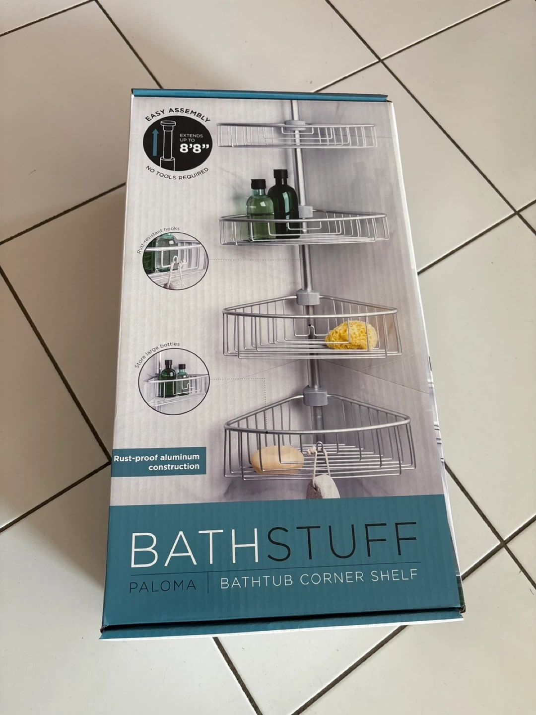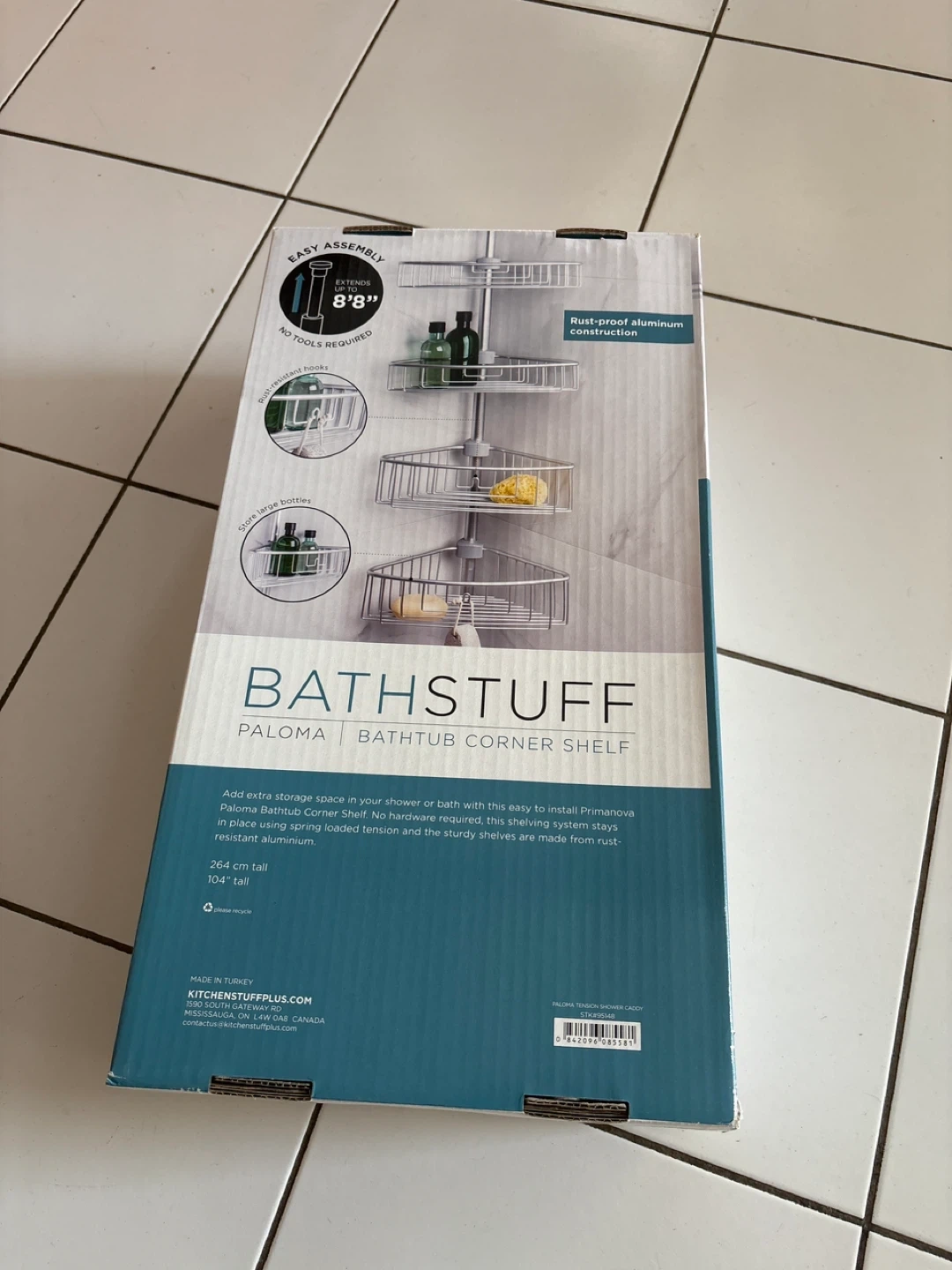 Selling a brand new BATHSTUFF Paloma Bathtub Corner Shelf! It's still in its original packaging and ready to add some storage to your shower or bath. It extends up to 8'8" and has rust-proof aluminum construction. Easy to assemble, no tools required!