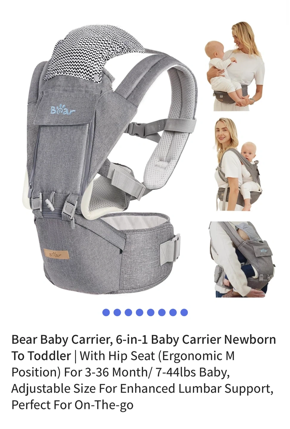 55This Bear Baby Carrier is perfect for newborns to toddlers! It's a 6-in-1 design with a hip seat for ergonomic M positioning. Suitable for babies 3-36 months (7-44lbs). It features adjustable size for enhanced lumbar support, making it perfect for on-the-go parents! Includes a windshield cap and storage bags. Cash only and pickup near Londonderry mall