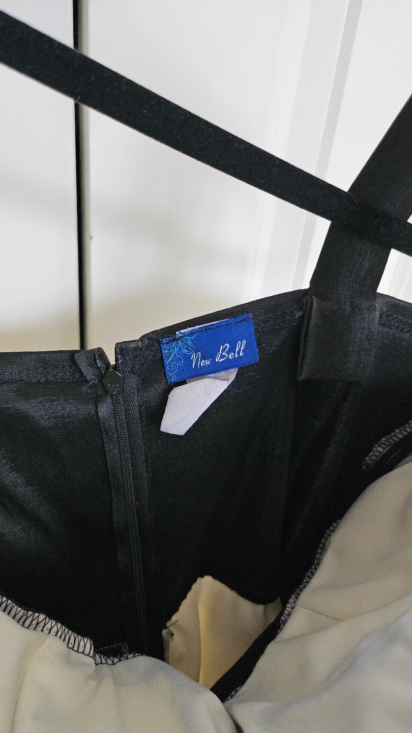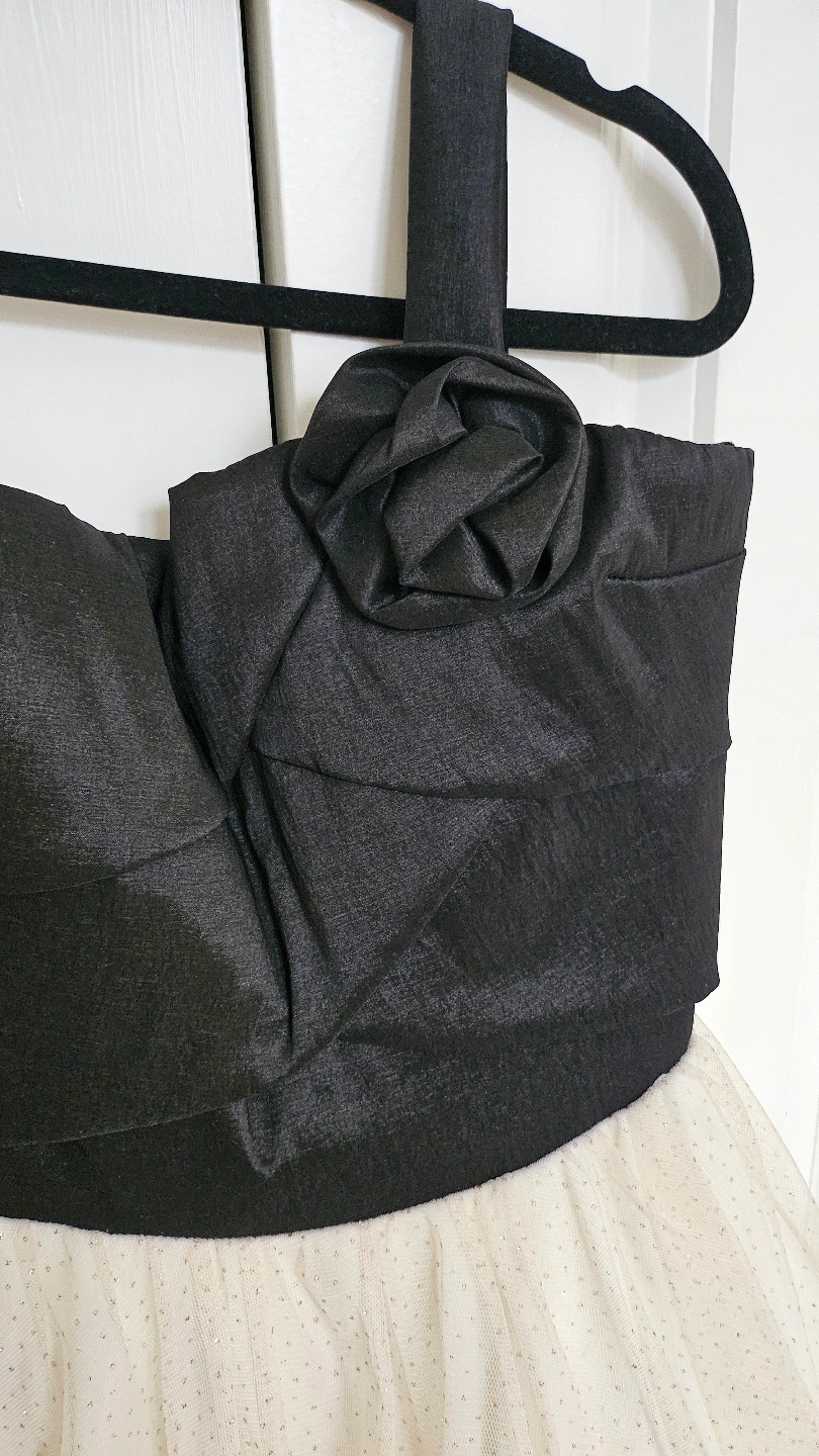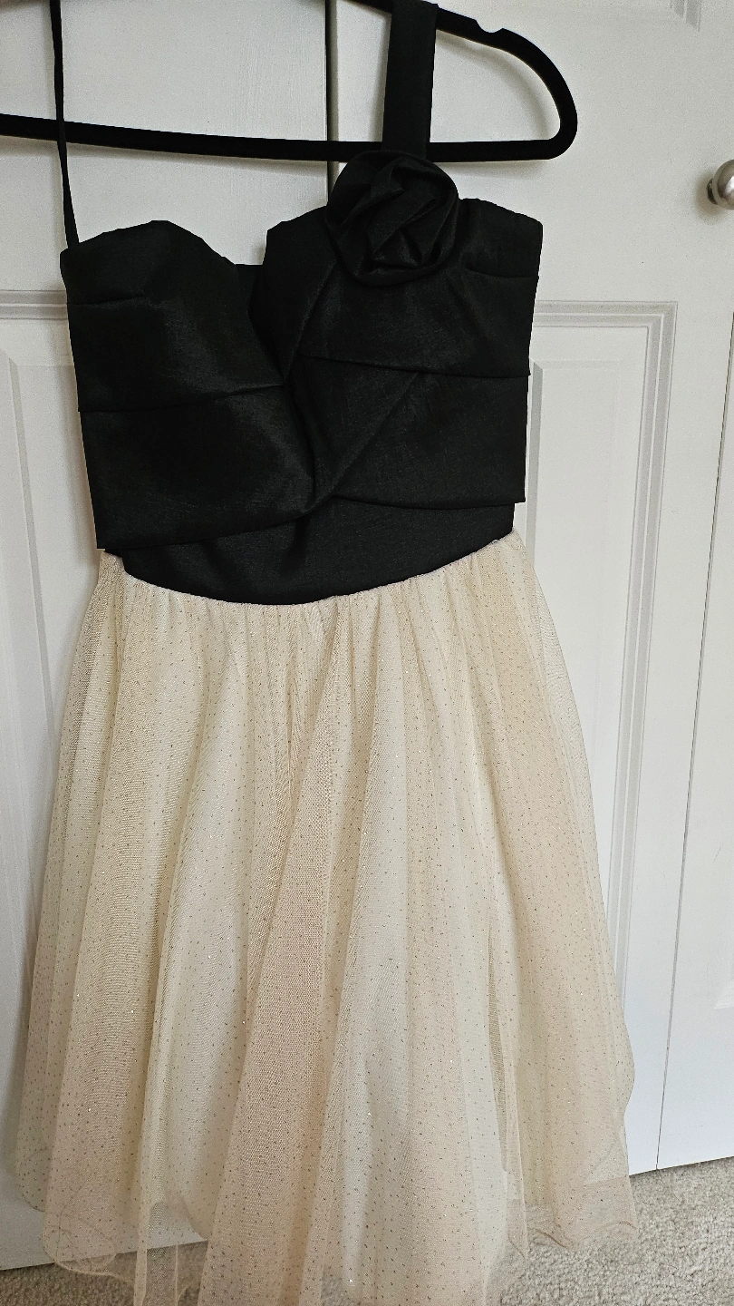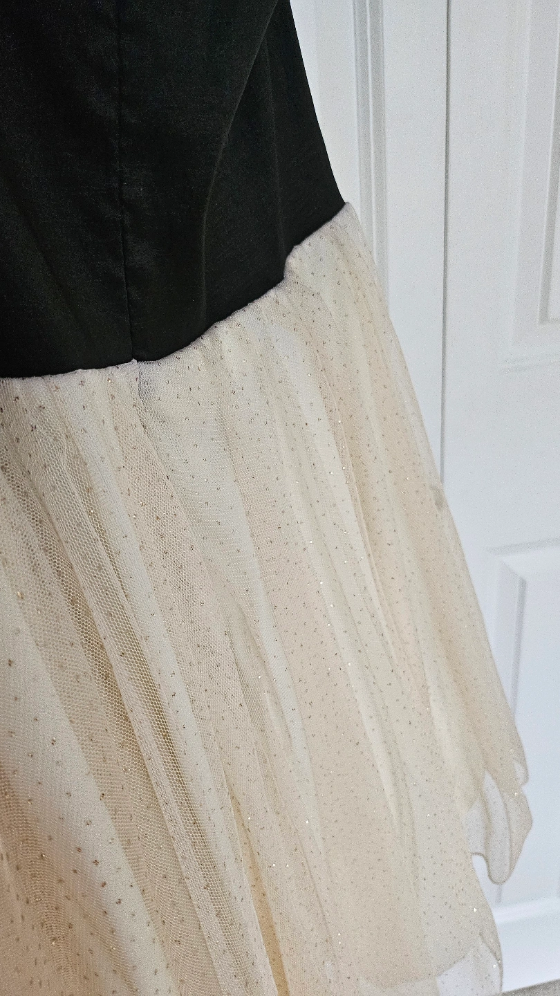 32Beautiful dress. One shoulder design. Black bodice with rosette detail. Champagne tulle skirt with glitter. Zip closure. Great for party or special occasion. Size xs/s for girl/teens