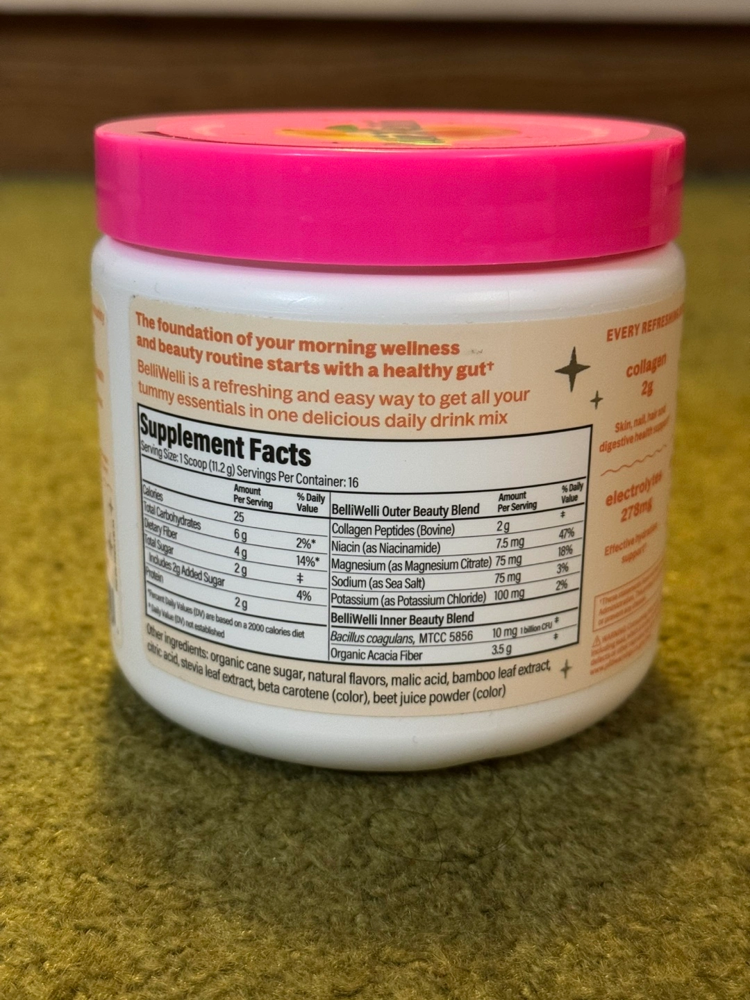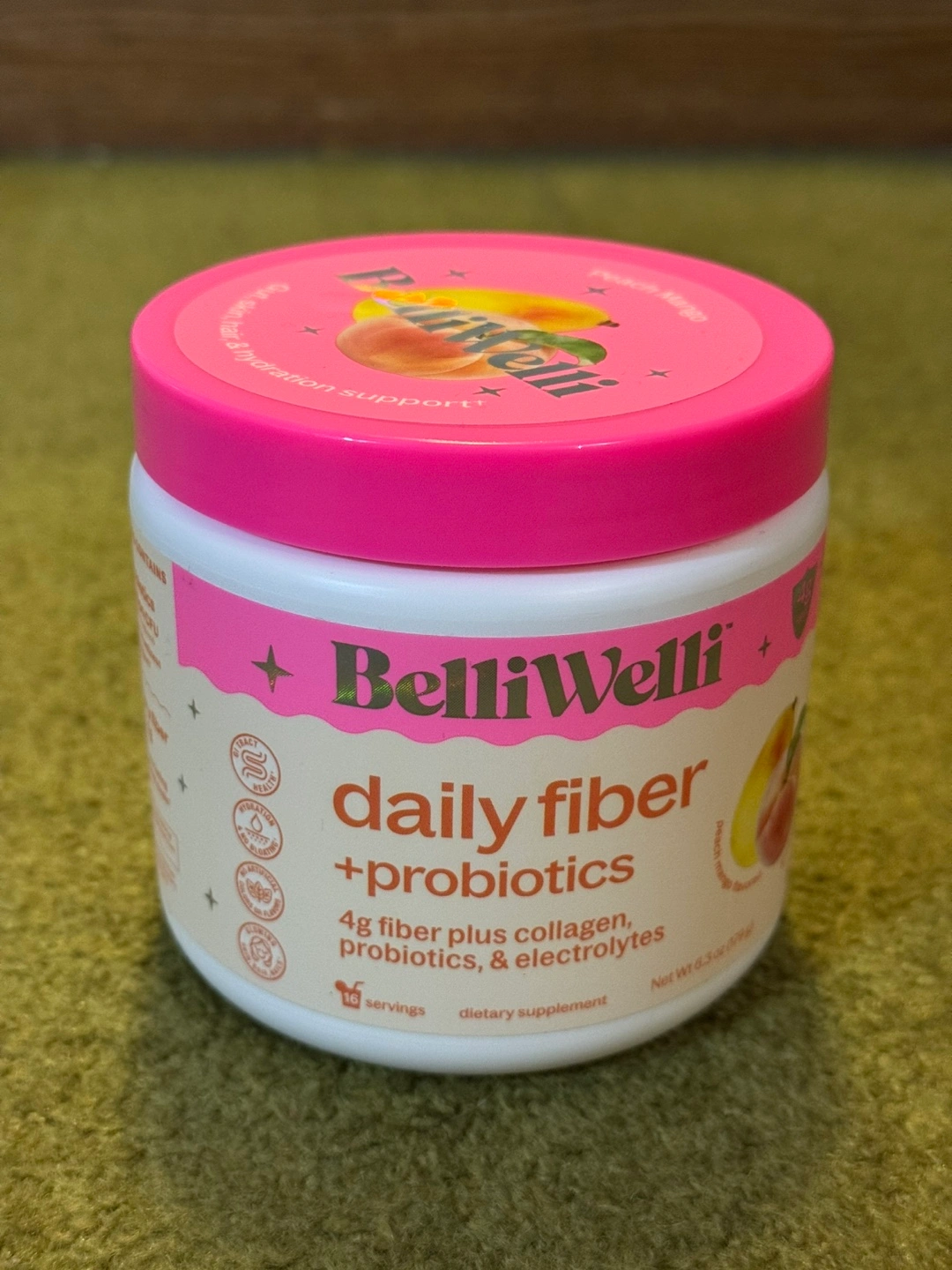I'm selling a container of BelliWelli Daily Fiber + Probiotics. It contains 4g of fiber plus collagen, probiotics, and electrolytes. It's a dietary supplement to add to your wellness and beauty routine! It’s unopened still sealed. I don’t reach for it as often.