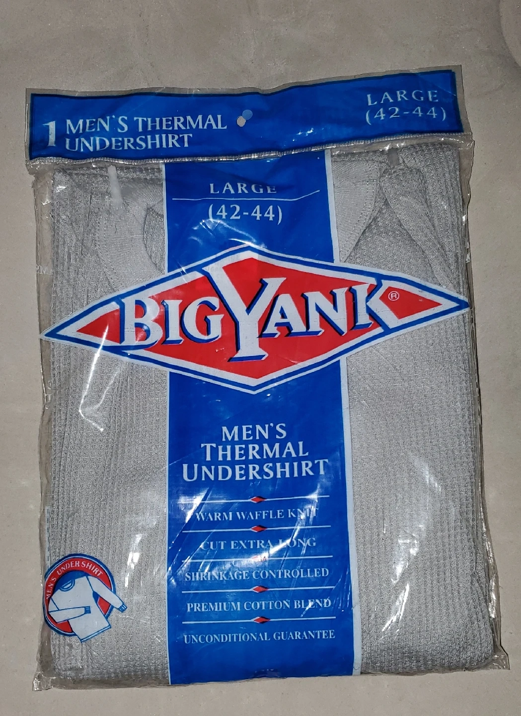 22I'm selling a brand new Big Yank men's thermal undershirt in size large (42-44). It's a warm waffle knit with a cut that's extra long. The material is a blend of 60% cotton and 40% polyester and is shrinkage controlled