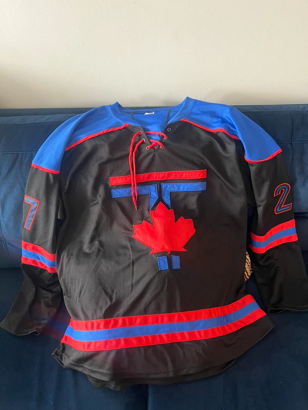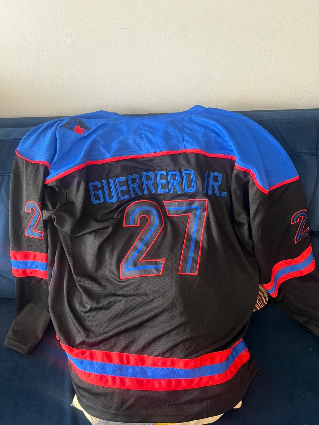 Never worn! Selling a Guerrero Jr. #27 baseball jersey. It's in great condition and ready for a new fan! The jersey features a black body with blue and red accents, including the number 27 and 'Guerrero Jr.' on the back. Perfect for showing your support at the next game