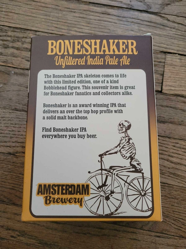 The Boneshaker Bobble Head from Amsterdam Brewery is a must-have collectible for any beer enthusiast. This exclusive item features the iconic Boneshaker beer logo and is a perfect addition to your collection. Made with high-quality materials, this bobblehead is a unique piece that showcases your love for Amsterdam Brewery and their delicious craft beers. Add a touch of fun and personality to your space with this limited edition bobblehead.