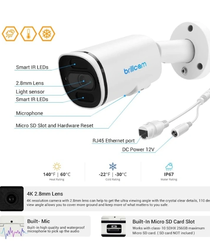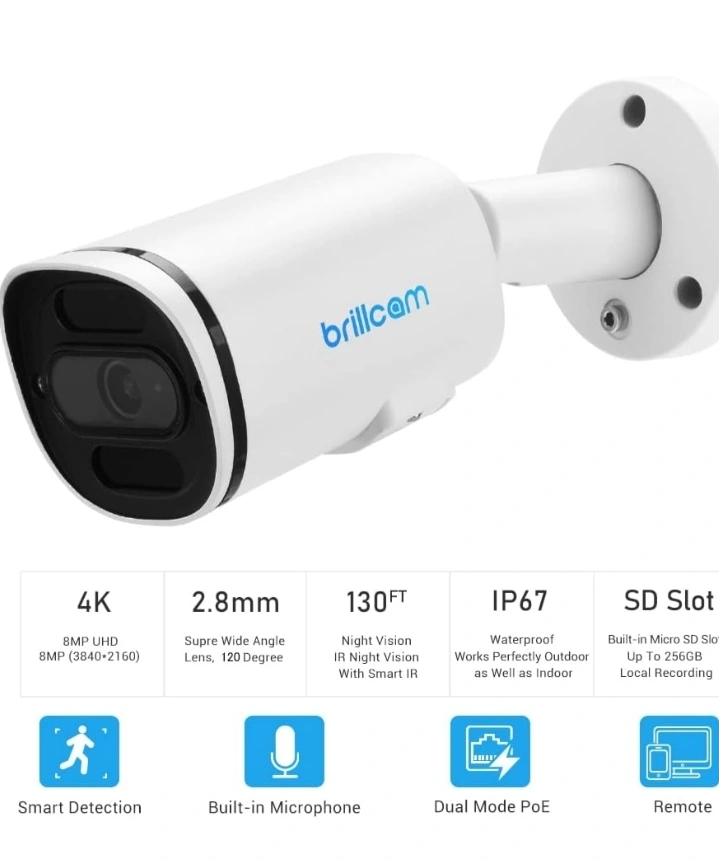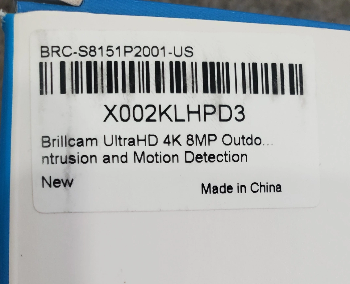 10Brillcam Ultra HD 4K 8MP Outdoor Camera – New Open Box Model: BRC-S8151P2001 Condition: New open box, never installed. Features: 4K / 8MP ultra-clear video Outdoor weatherproof Intrusion & motion detection Night vision Includes: Camera, manual, original box. Perfect for home or business security.