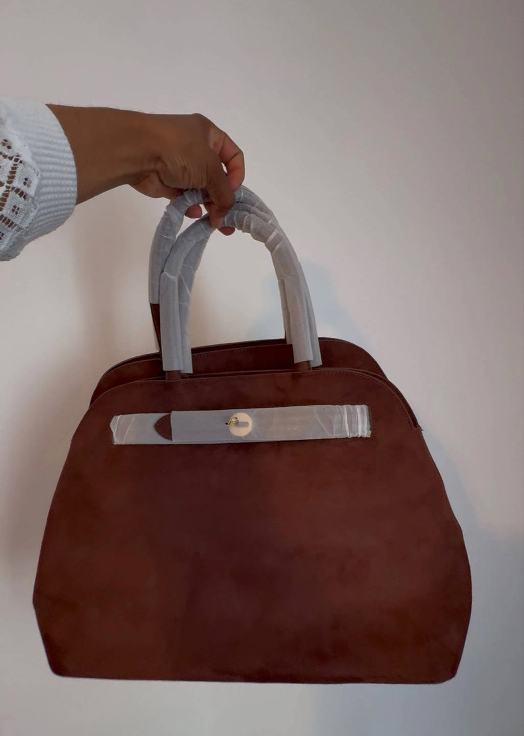 484New Brown handbag suede,With a gold-tone clasp and two rounded handles. It has a small pocket inside $27 each No delivery No holds Pick up at Cedarhill crescent Kitchener