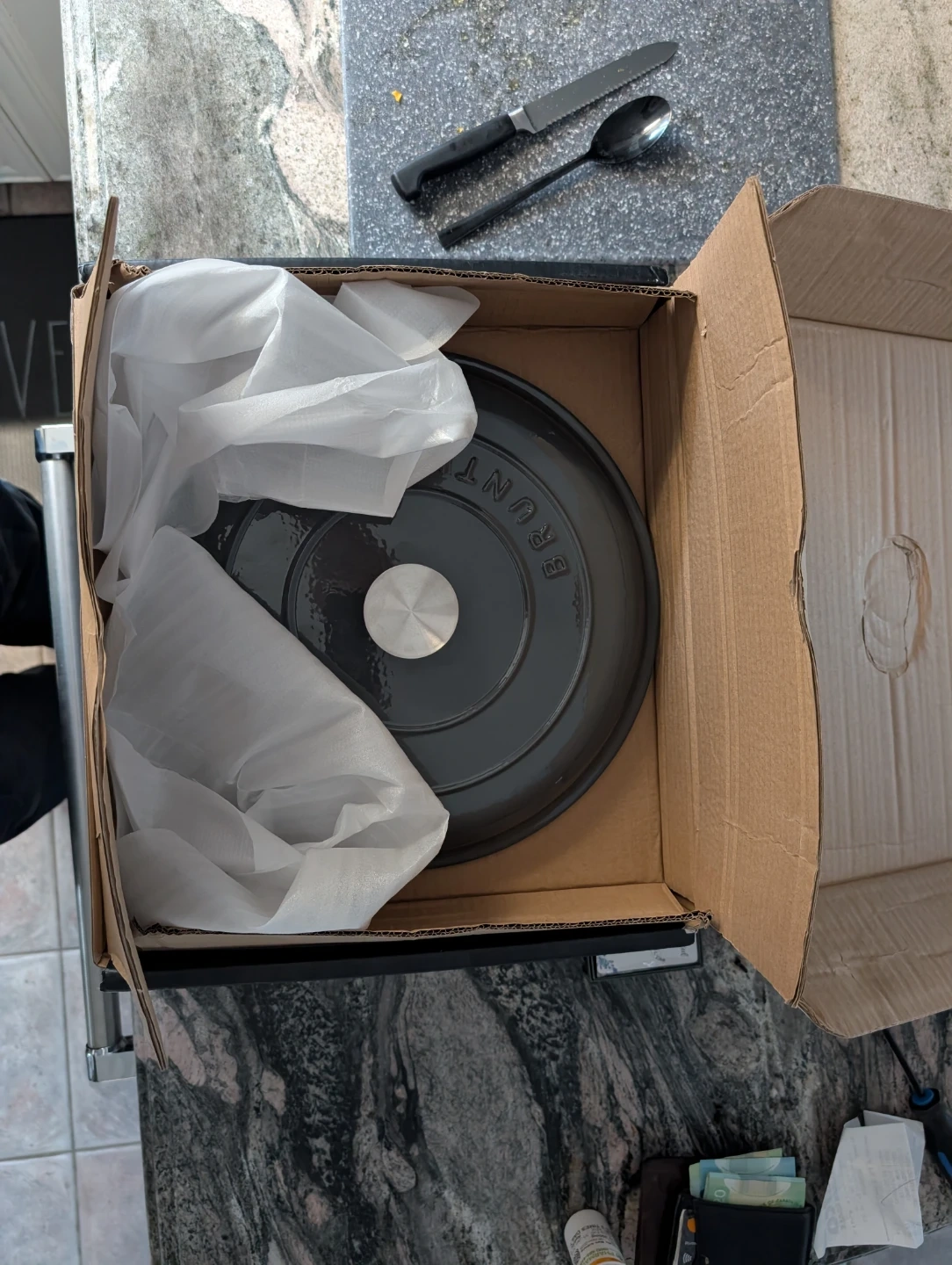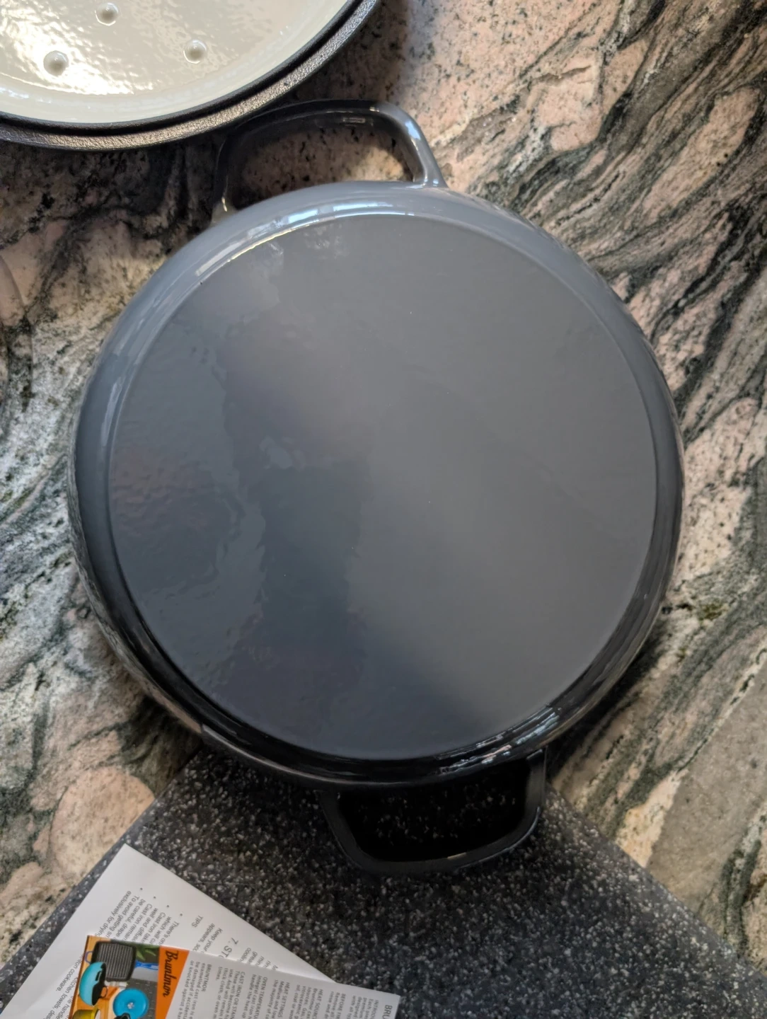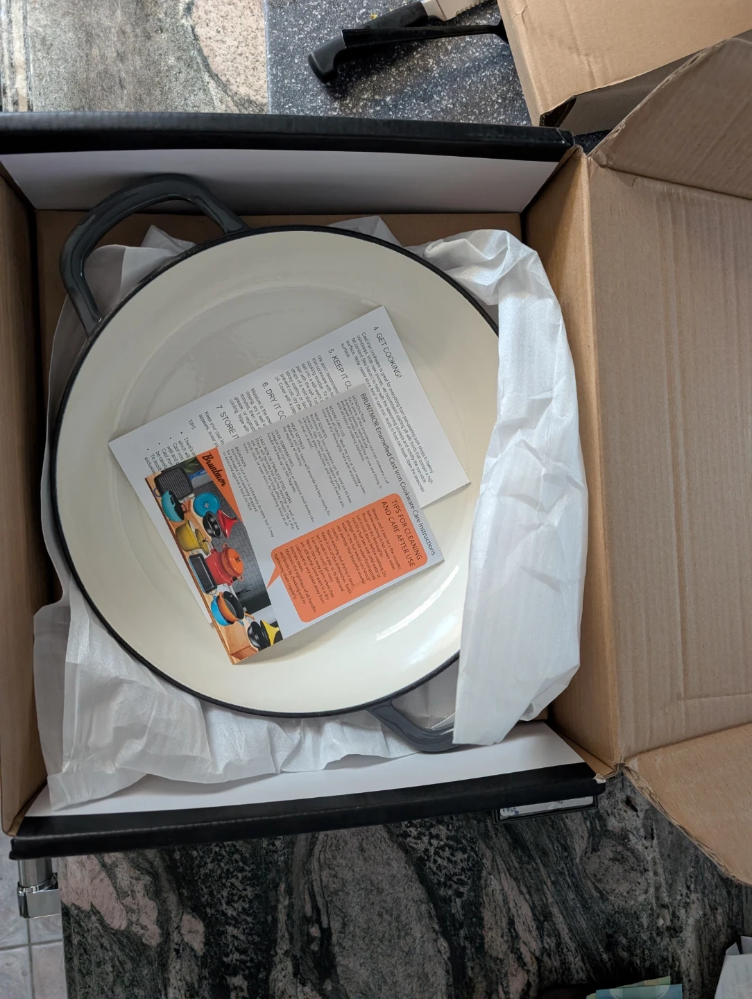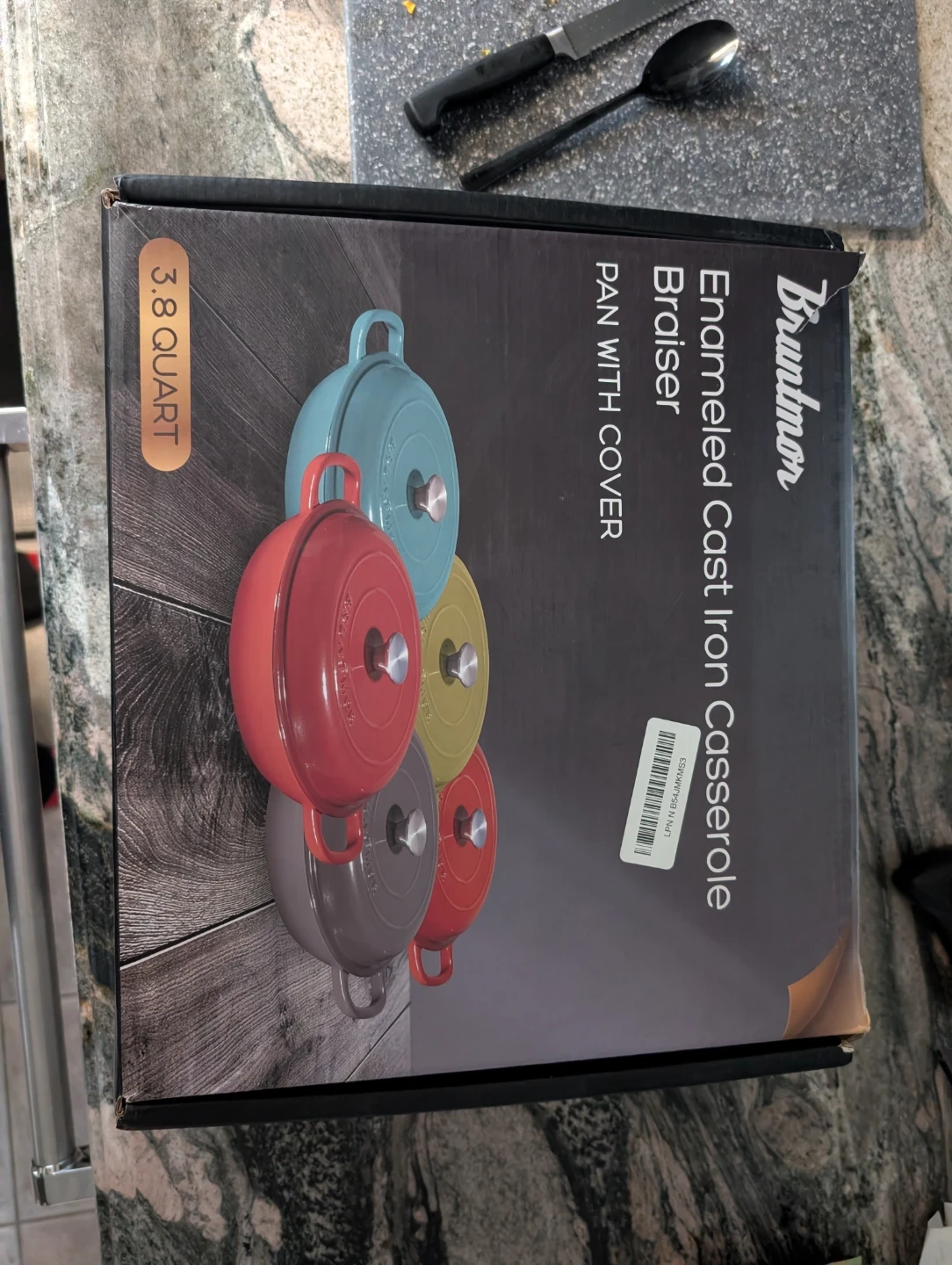 10I'm selling a brand new Bruntmor enamelled cast iron casserole braiser! It's a 3.8 quart pan with a cover. It comes in its original box.