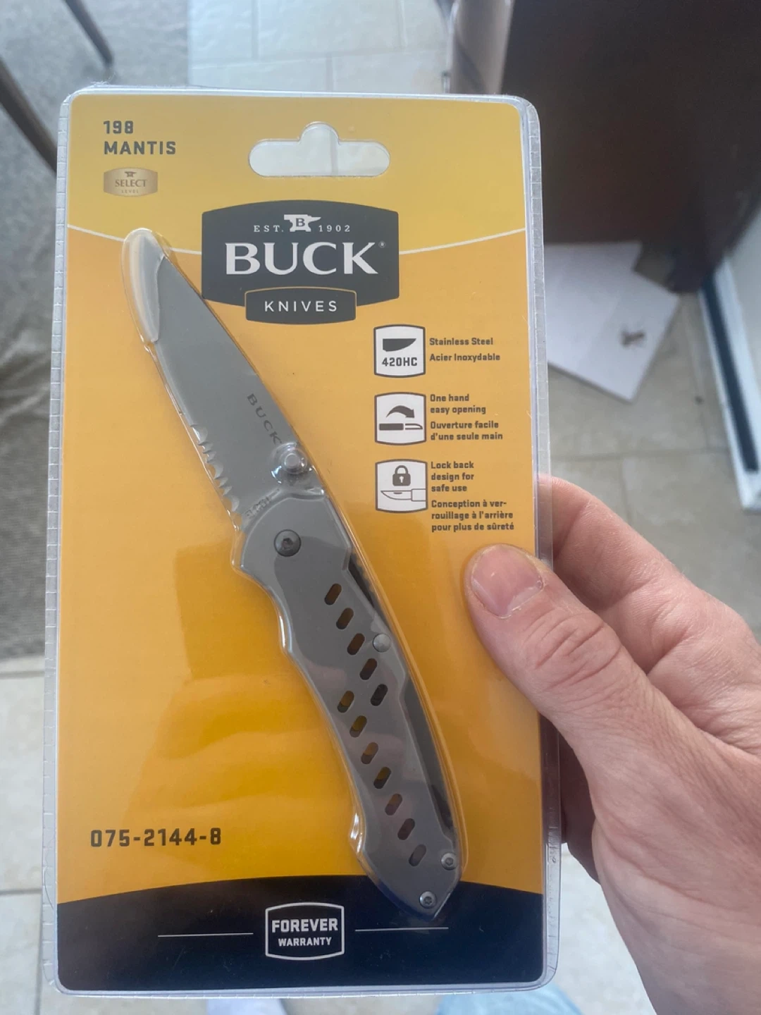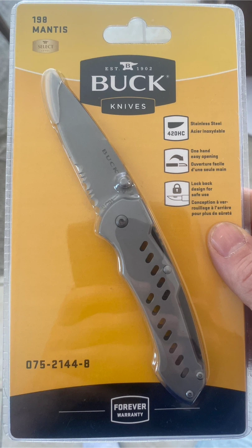 9Selling a brand new Buck 198 Mantis folding knife! It features stainless steel (420HC) blade, one-hand easy opening, and a lock back design for safe use. Comes with a forever warranty!