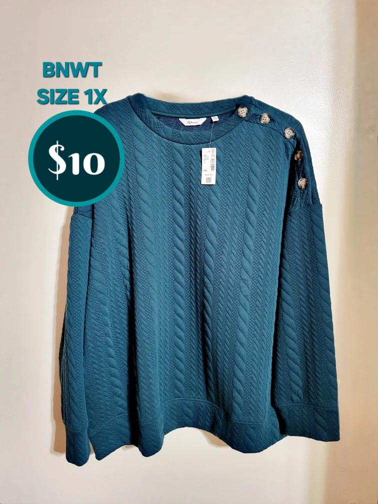 254Faux Cableknit Sweater -From/Brand: Reitmans -BRAND NEW WITH TAGS STILL ON! -Size: 1X (XXL) -Materials: Polyester and Elastane mix -Colour: Solid Deep Dark Green (closer to stock photo... my photo somehow came out waaay too light and looks like there's an ombre effect, but there isn't.) -Crew neckline -Button details down left shoulder -Textured cableknit pattern -Meets top of hip -Warm but not heavy on the body -Beautiful autumn colour that takes you seamlessly into the winter season! 📸PLEASE SEE PHOTO GALLERY FOR MORE DETAILS ABOUT THIS ITEM📸 Asking only $10 (FIRM & FINAL) **Paid $20 + taxes. YOU ARE GETTING A DEAL AT JUST $10 FLAT. 💰CASH ONLY, PLEASE💰 ⚠️Please only message if you are SERIOUS about buying AND you know when you'd like to pick up.⚠️ 🚙Located in North Oshawa BEATRICE & RITSON area.🚙 ⏰️No holds longer than 2 days.⏰️ ❗️CROSS POSTED❗️