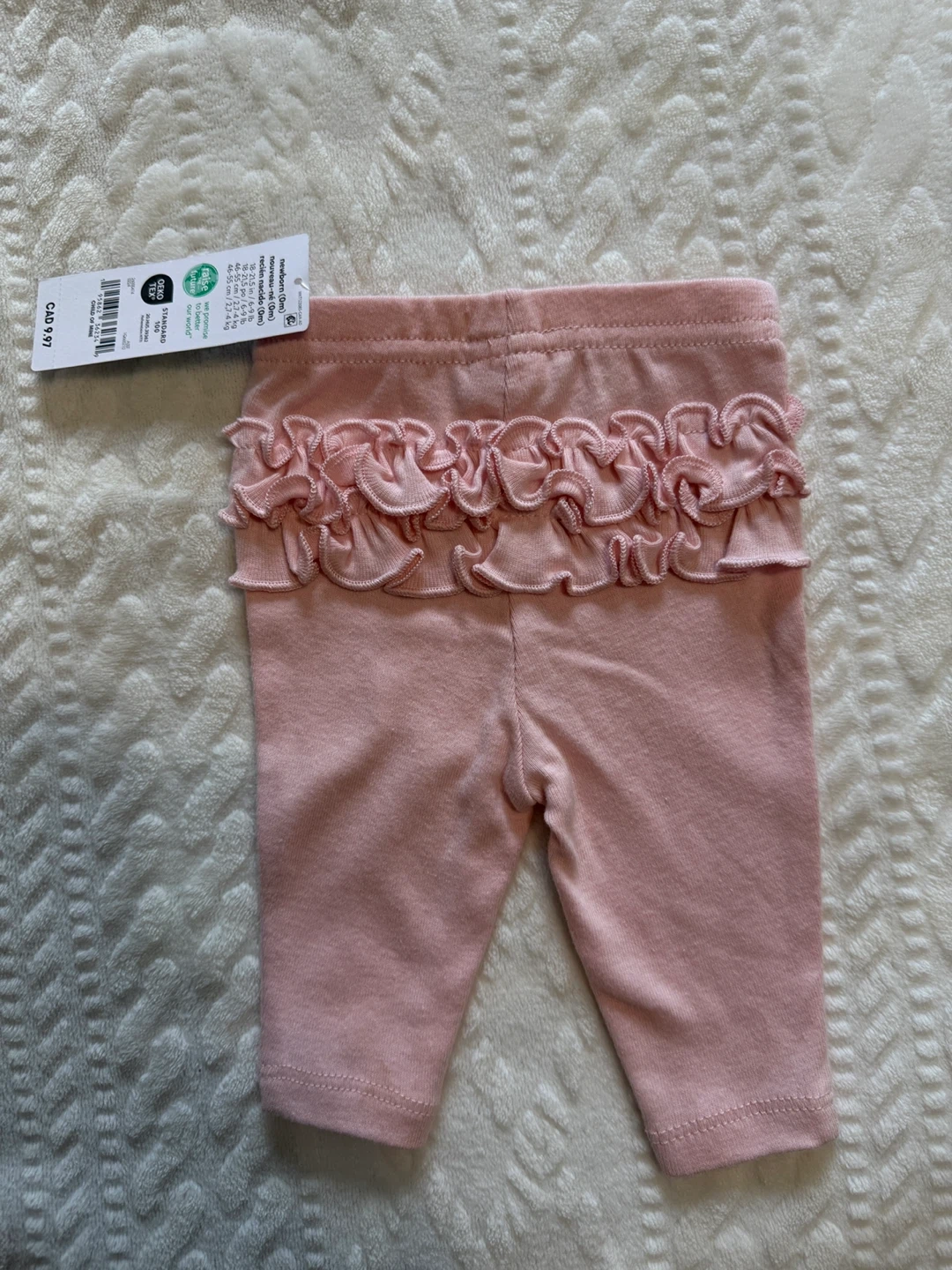 These are a brand new pair of Carter's Child of Mine leggings for newborns (0m)! They're a sweet light pink colour and have a cute ruffle detail on the bum. The tag shows they were originally $9.97 CAD
