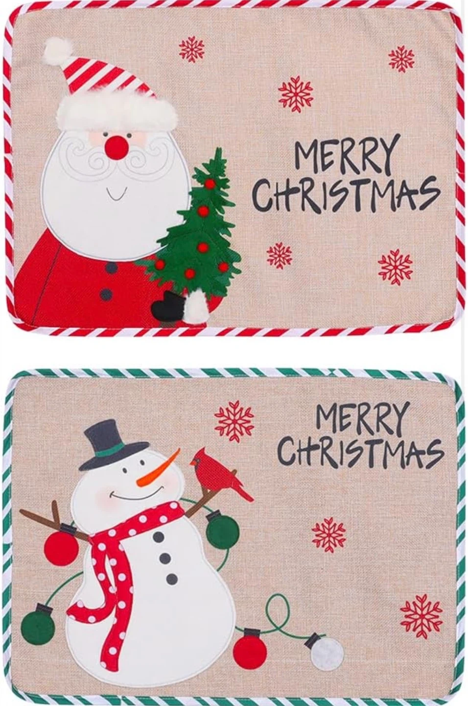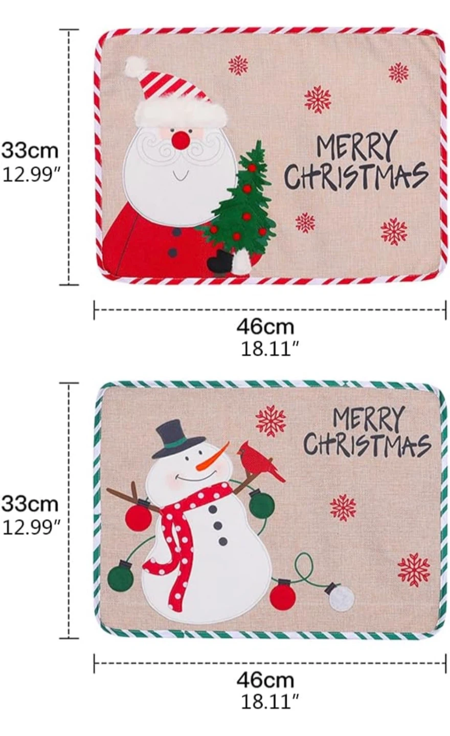 Get ready for the holidays with these festive placemats! They feature adorable Santa and snowman designs to add a touch of Christmas cheer to your table. Each placemat measures approximately 18.11" x 12.99".