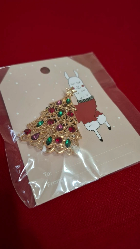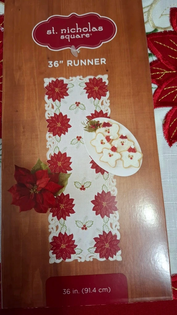 232Selling Christmas themed items! A set of tea towels new in package with a cute 'Santa Have a Cookie' design, perfect for the holidays! $10 A new in package St. Nicholas Square 36" runner with a lovely poinsettia pattern, ideal for adding a festive touch to your table. $10 A Christmas tree brooch in its original package. $5