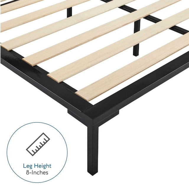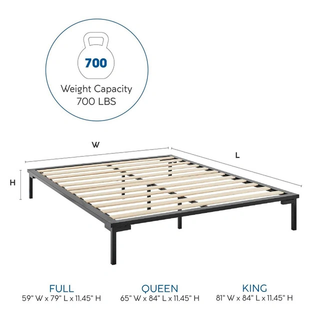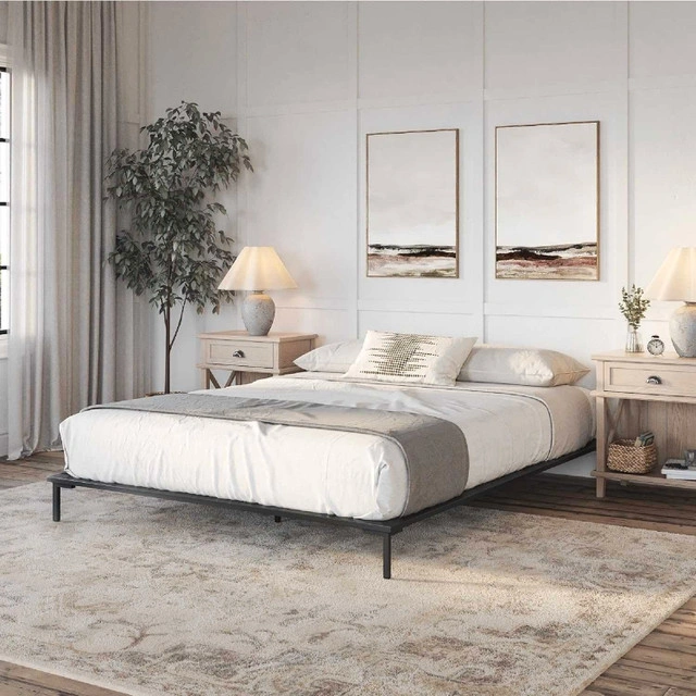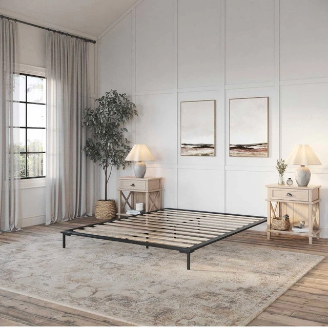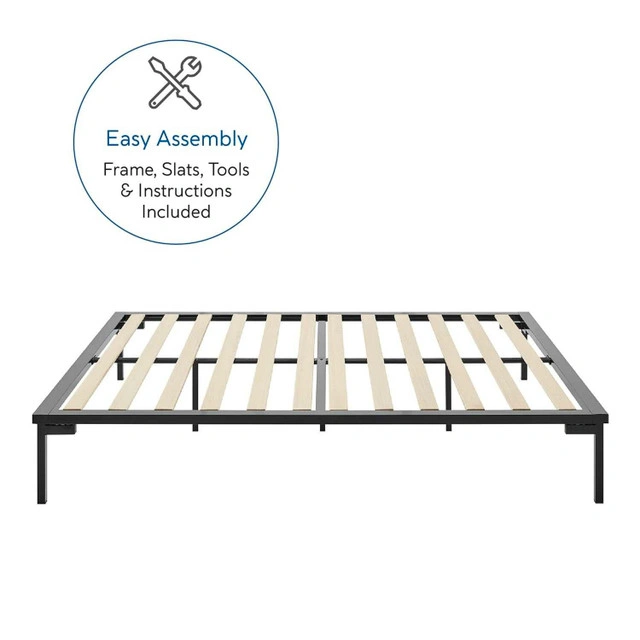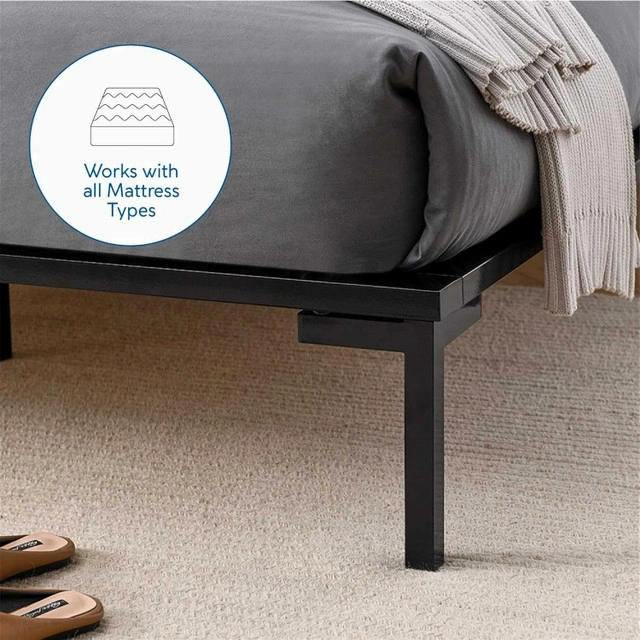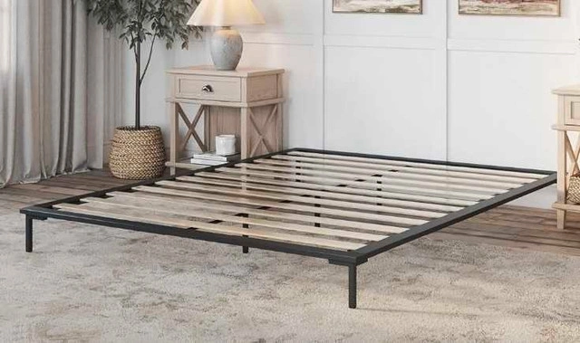 Brand New bed frame. Comes unassembled in original SEALED box with all manufacturer parts and hardware for easy assembly. ** Only the bed frame for sale. Mattress not included and sold separately. Pickup from south London. I can deliver in London for an extra fee. Product details: Brand: Classic Brands Item model number: J10222-0016 Size: King Material: Metal and wood Style: Metal Bed Colour: Black Maximum weight recommendation: 700 Pounds Item weight: 70.28 Pounds Included components: Bed Frame, Assembly Instructions Dimensions: 80" W x 84" L x 11.45" H STRONG DURABLE LIGHTWEIGHT FRAME -Sturdy steel bed frame with 2-inch wood slats and 6 legs give extra support for today's heavier mattresses; maximum weight capacity 700 lbs. SUPER ADAPTABLE - Our simple go-anywhere bed frame feels right at home in every type of decor and bedroom NO BOX SPRING NEEDED - Wood slats fit tightly into bed frame to provide additional support; mattress (not included) LOW COST QUALITY ALTERNATIVE - Compare to other Scandinavian type platform bed frames and ideal compliment to your bedroom set Description: Our Vibe Wood Slat and Metal Platform Bed Frame Base is the perfect solution for those that want the support of a mattress foundation or box spring without the additional cost. Our lightweight but durable platform bed frame gives you that strong and sturdy reinforcement of a mattress foundation plus a bed frame. The wood slats offer even weight distribution to prevent the mattress from sagging and gives extra support to increase the longevity of your mattress investment.