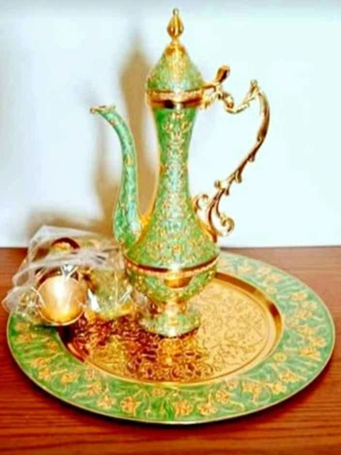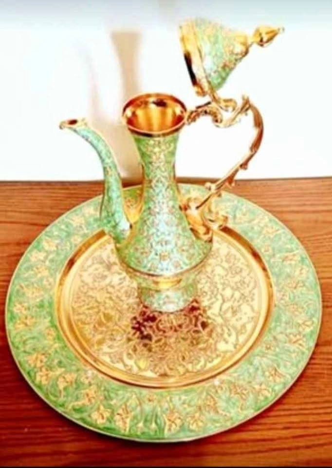 Brand New Stunning, Centerpiece , Decorative Handmade Cloisonne Green Enamel Brass Turkish Coffee Set , Stones Ornated Tray Coffee Dallah 6 Cups ( sealed) Mint Condition Please check out my rare collectibles!