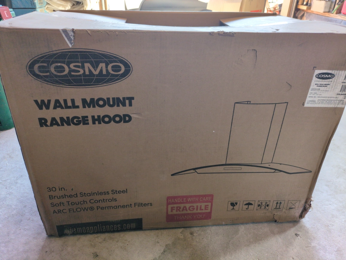Selling a brand new Cosmo wall mount range hood! It's 30 inches and features brushed stainless steel with soft touch controls. It also has ARC FLOW permanent filters. brand new ...still on box