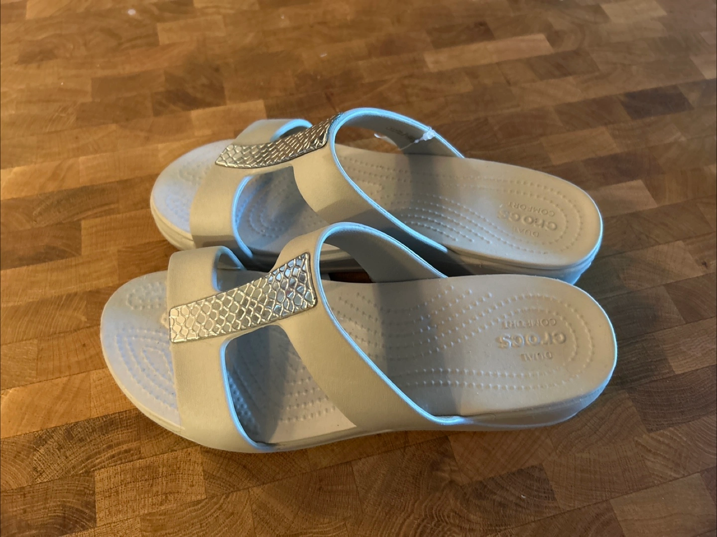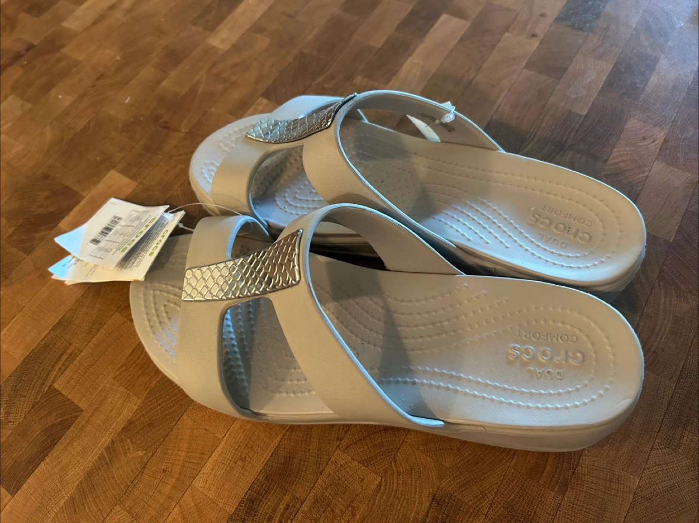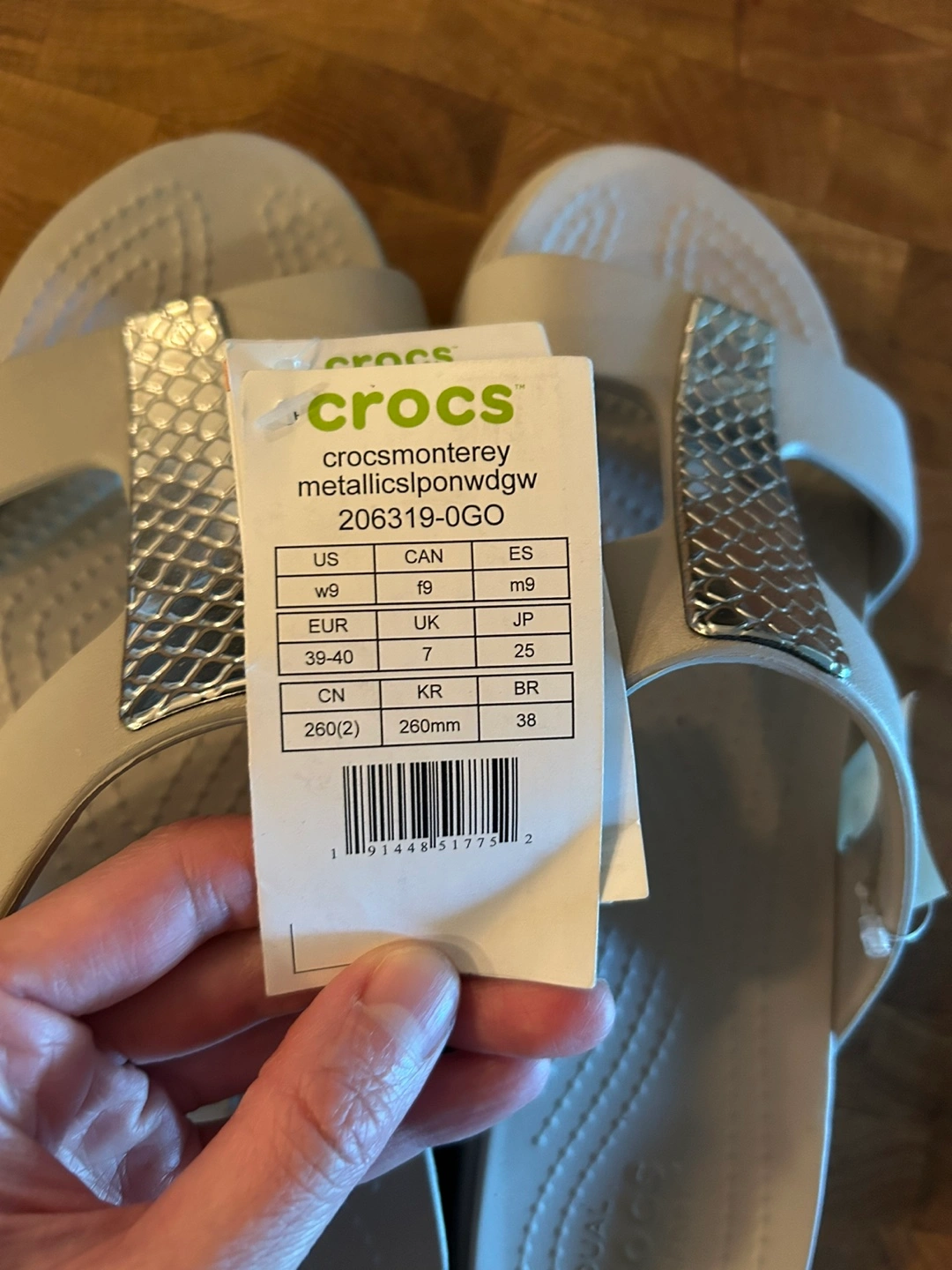 These are brand new Crocs Monterey Metallic sandals in a women's size 9! Never worn. They are a stylish and comfortable option for everyday wear. The metallic detailing adds a touch of flair to the classic Crocs design