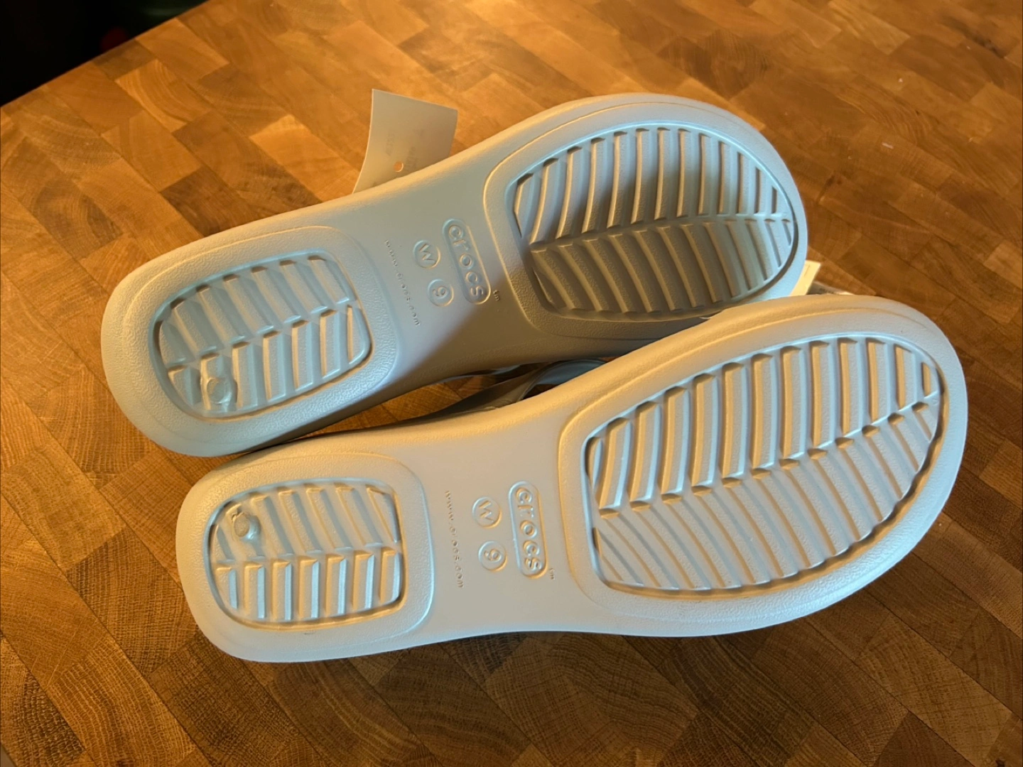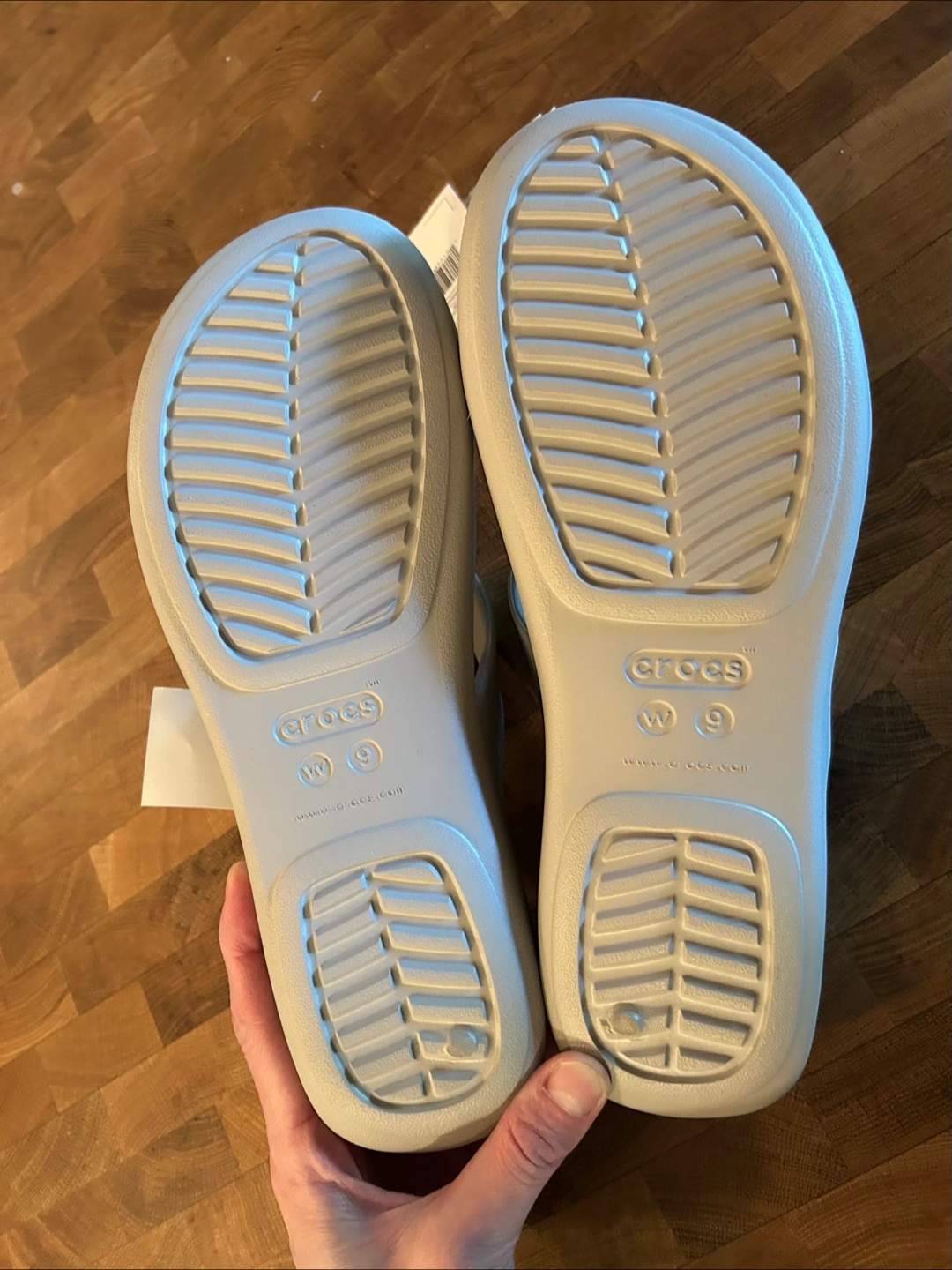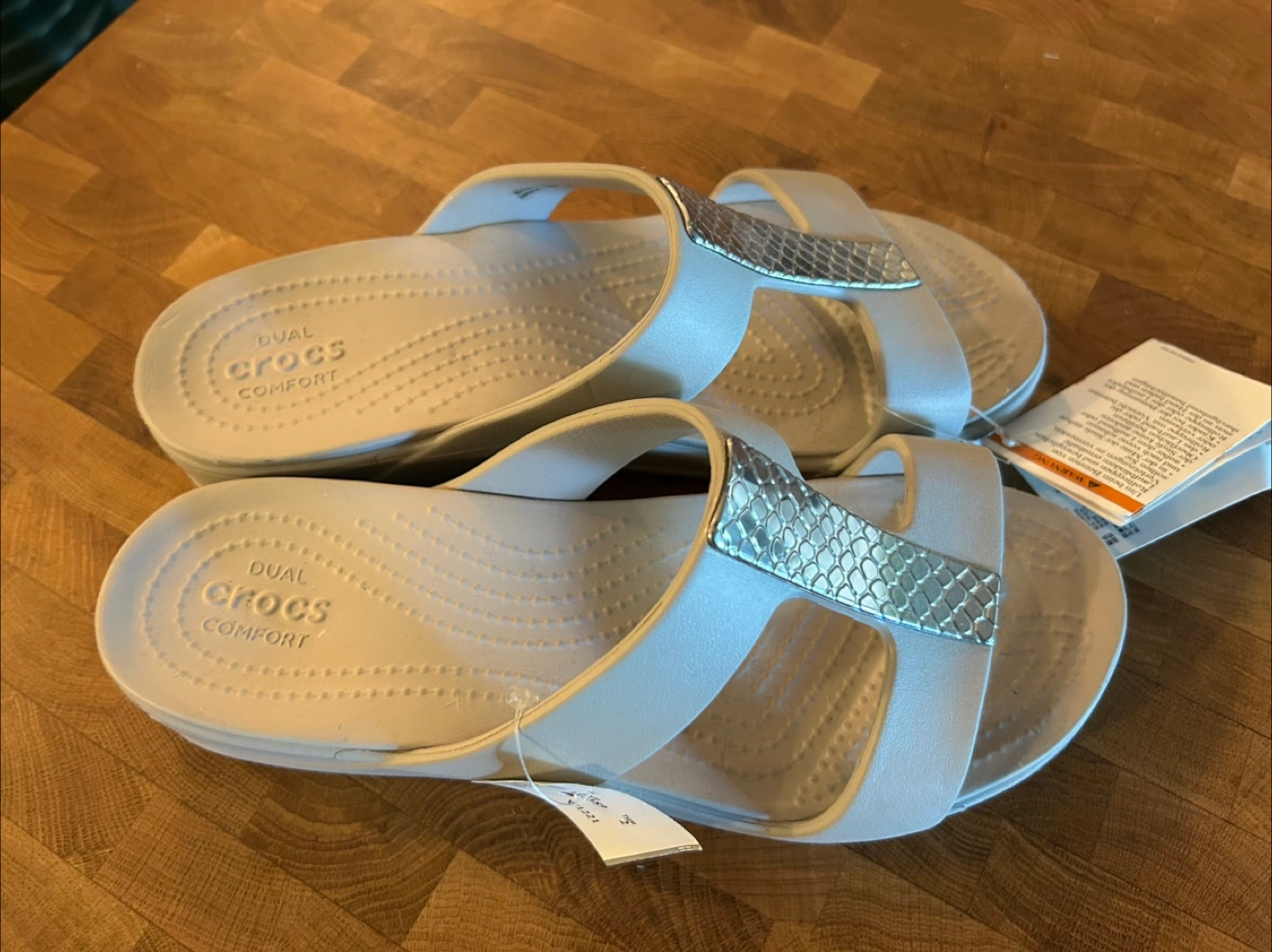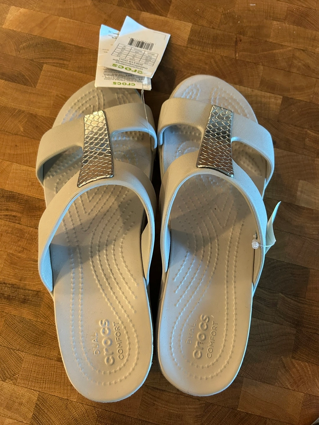 These are brand new Crocs Monterey Metallic sandals in a women's size 9! Never worn. They are a stylish and comfortable option for everyday wear. The metallic detailing adds a touch of flair to the classic Crocs design