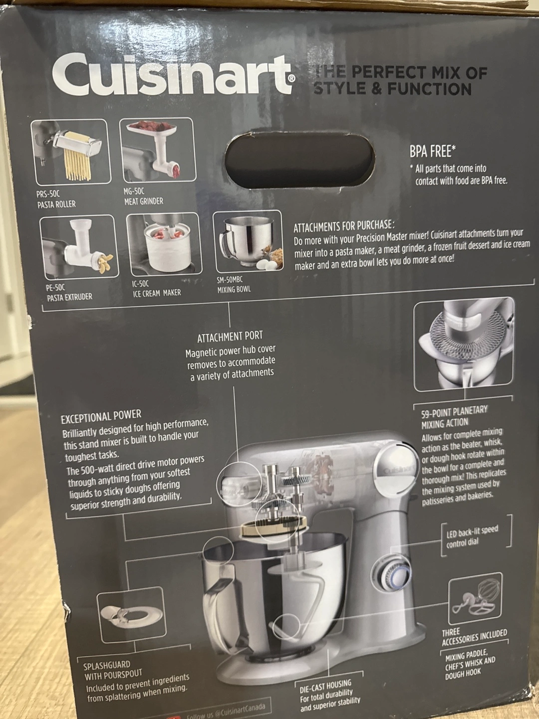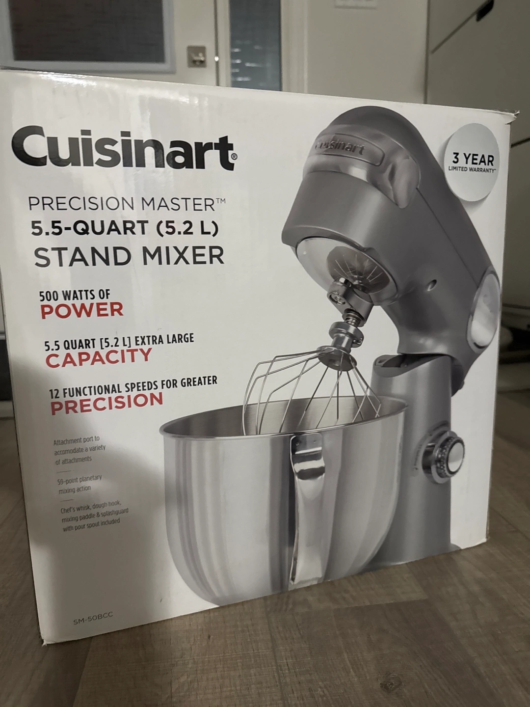 Selling a brand new Cuisinart Precision Master 5.5-Quart Stand Mixer. It has a 5.5 quart [5.2 L] extra large capacity and 500 watts of power. This mixer has 12 functional speeds for greater precision. Included are three accessories: a mixing paddle, chef's whisk, and dough hook. It also has a splashguard with a pour spout to prevent ingredients from splattering