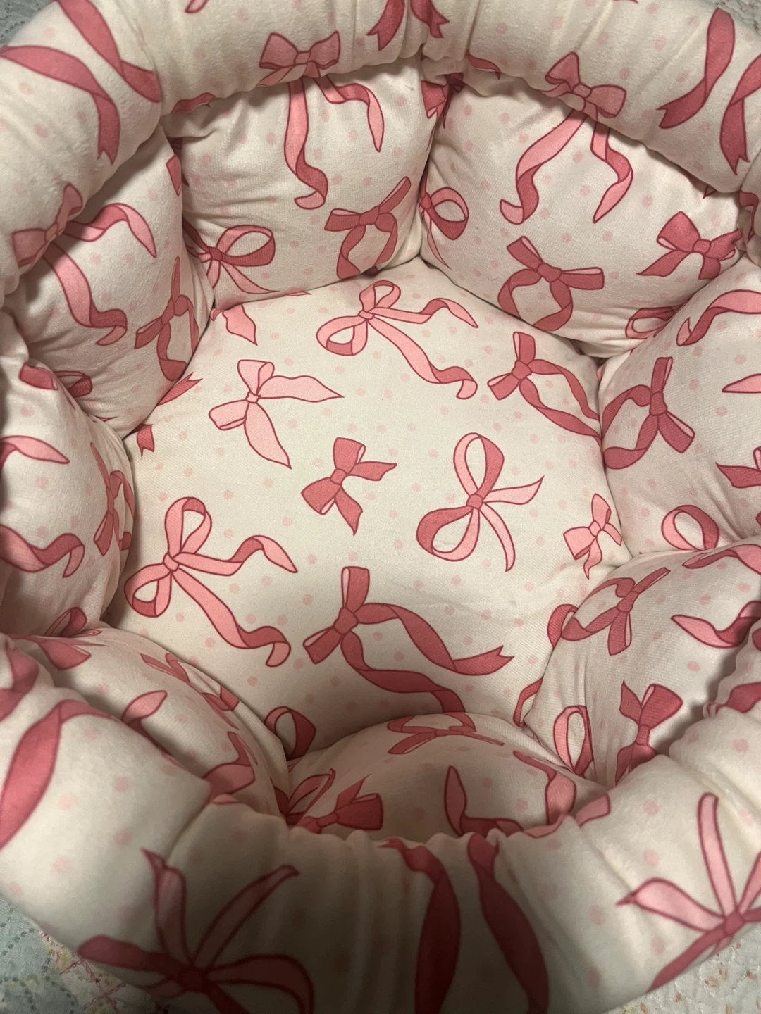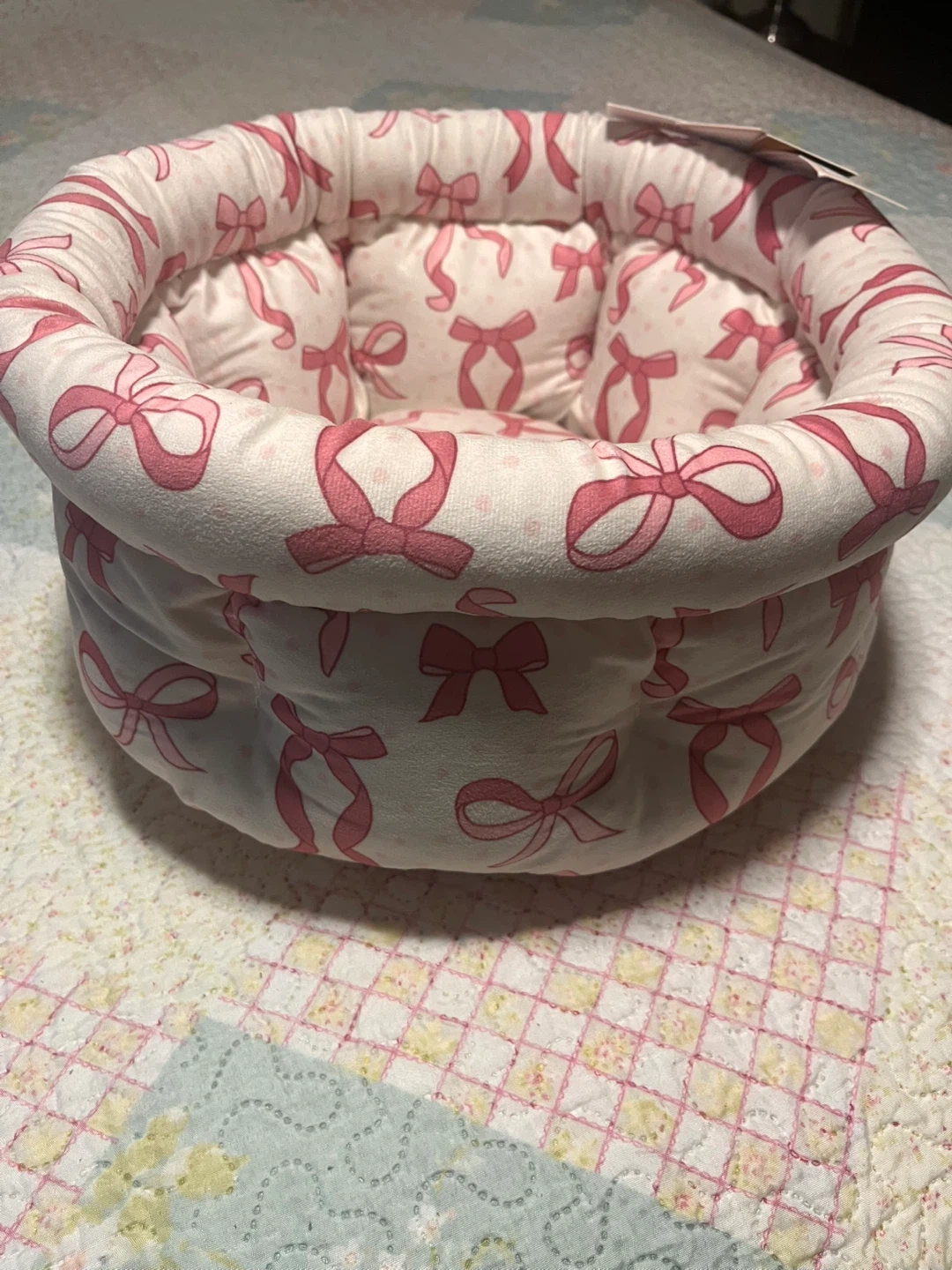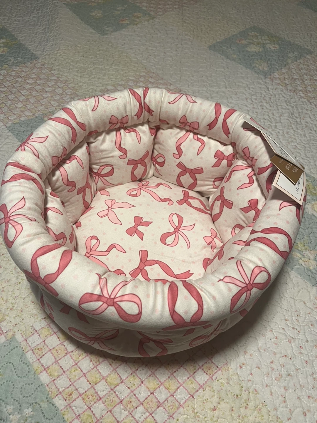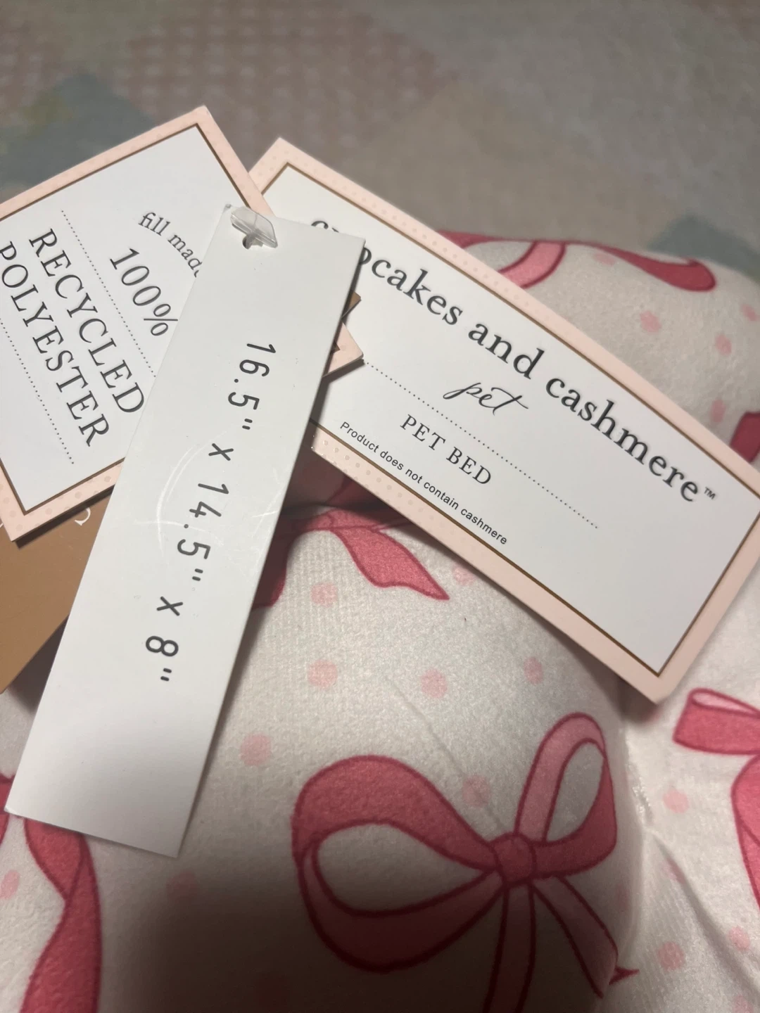 This Cupcakes and Cashmere pet bed, sized at 16.5" x 14.5" x 8", features a charming pink bow design and is filled with 100% recycled polyester, providing a cozy and eco-friendly rest for your furry friend; it's brand new with tags. * Size: 16.5" x 14.5" x 8" * Material: 100% Recycled Polyester * Design: Pink Bows While I can't guarantee your pet's dreams will be filled with endless fields of squeaky toys and belly rubs, this bed certainly sets the stage for some seriously comfy slumbers! P.S. If you're reading this, the pet bed is still available, ready to become your pet's new favourite napping spot! I have 2. Moving. Everything must go