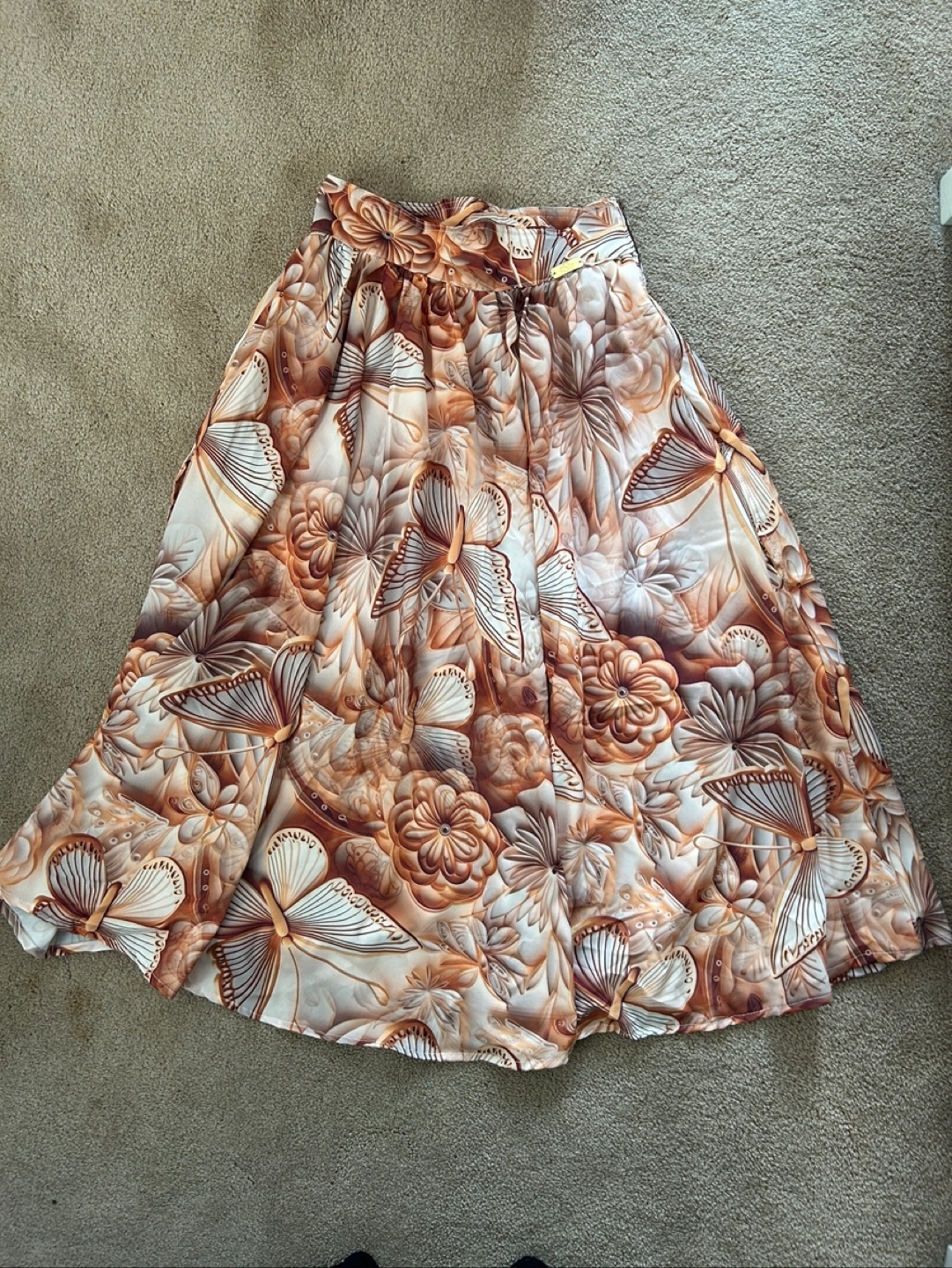 899New - never worn! XS Beautiful midi skirt. Features a floral and butterfly print. zipper closure. Lightweight material.