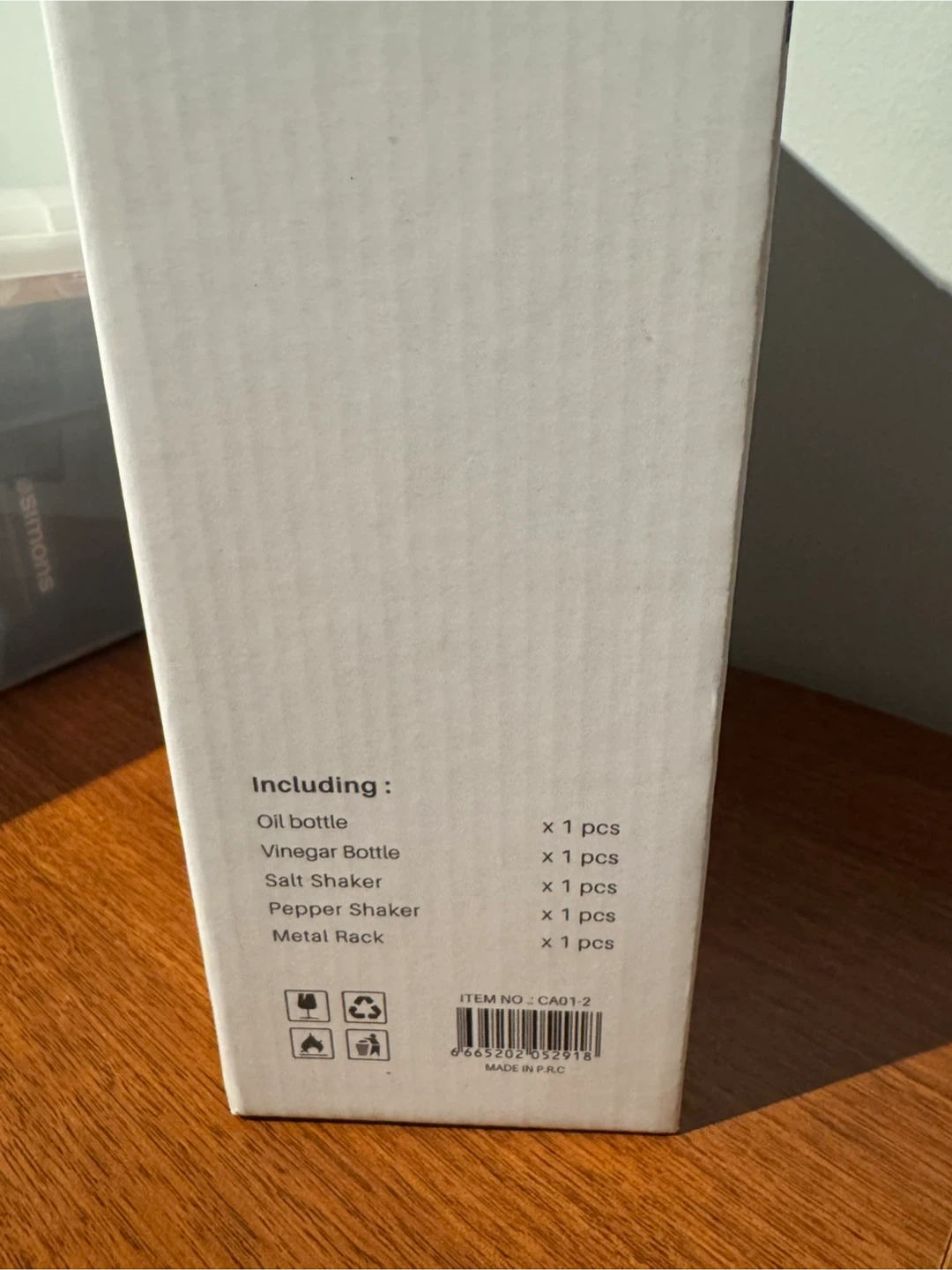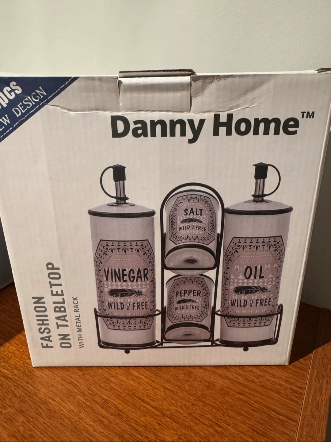 44Selling a Danny Home oil and vinegar bottle set with a metal rack. The set includes: - Oil bottle - Vinegar bottle - Salt shaker - Pepper shaker - Metal rack New. Unopened.
