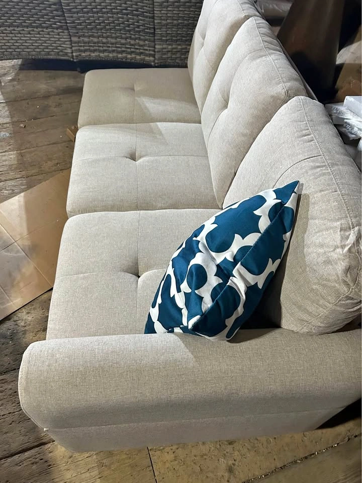 24This fabric linen beige color sectional sofa has gleaming silver nailed trim pops against the dark upholstery of this inviting sectional sofa. Designed for stylish functionality, the sectional features convenience features like a cushion that converts to a cupholder on movie night. Charming button tufting highlights each cushion while fancy blue herringbone-style accent pillow deliver modern texture, color and indulgence. Note: this is only one piece of a complete L-shaped sectional. Use an end table at the one end to complete it. Item is located in Port Robinson