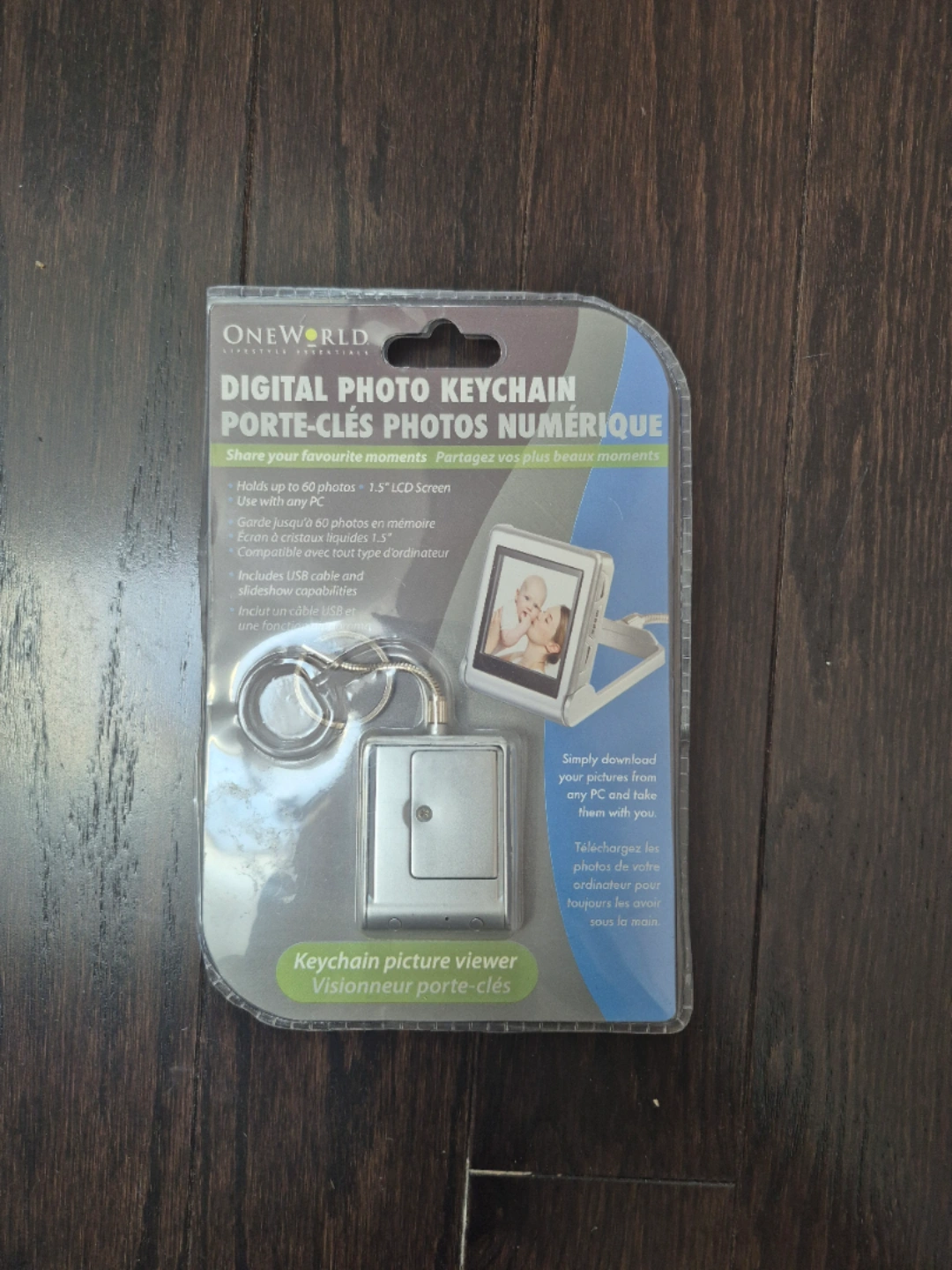 60Selling a brand new Oneworld Digital Photo Keychain! It holds up to 60 photos on a 1.5" LCD screen. It also includes a USB cable and slideshow capabilities. Never been opened!