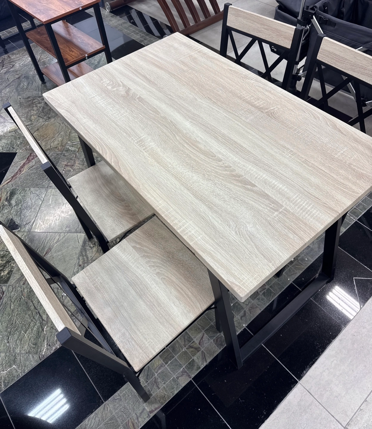 59Here's a dining table set that includes four chairs! The table is 43.3" x 26.77" and stands 29.52" tall. The chairs are designed with an 'X' back and are 33.46" in height. Perfect for a cozy dining space