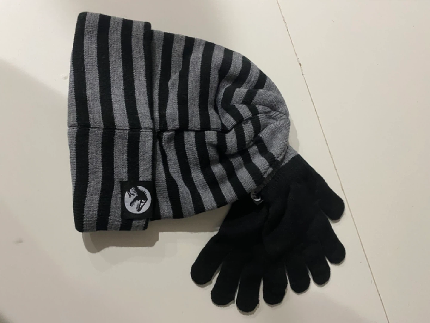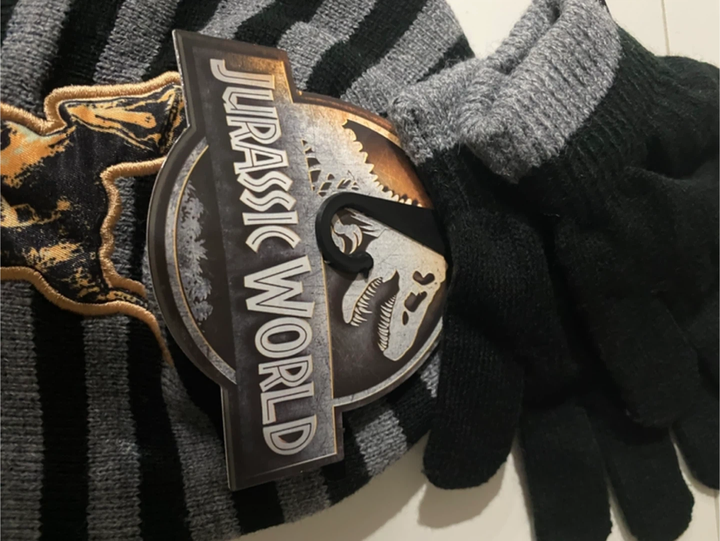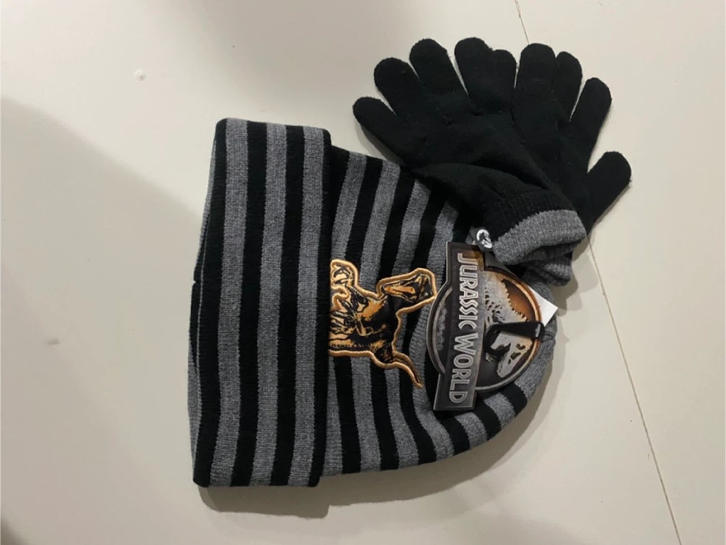 Keep your little one warm with this Jurassic World beanie and gloves set! The beanie is grey and black striped, and the gloves are solid black with grey trim. Perfect for any young dinosaur fan! Pick up Sage Hill Cash pnly Check out my other items Pet and smoke free home