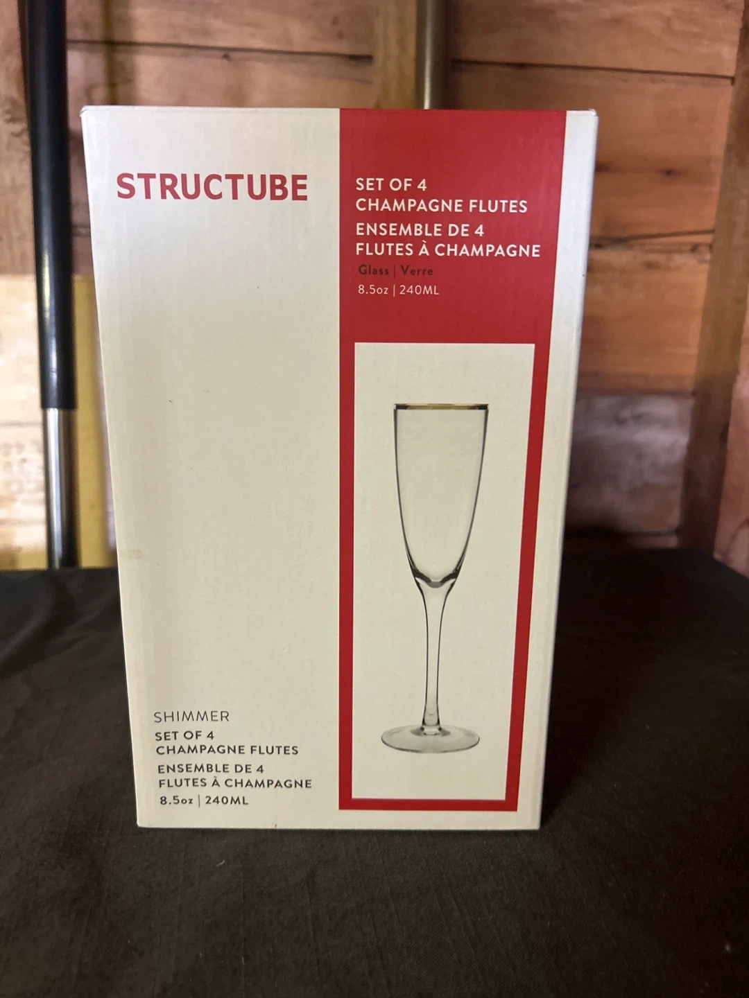 293Selling a set of 4 Structube Shimmer champagne flutes! They are 8.5oz / 240mL each. Add a classy touch with just a delicate gold edge. Perfect for celebrations or adding a touch of elegance to your everyday life Discontinued style, new in box