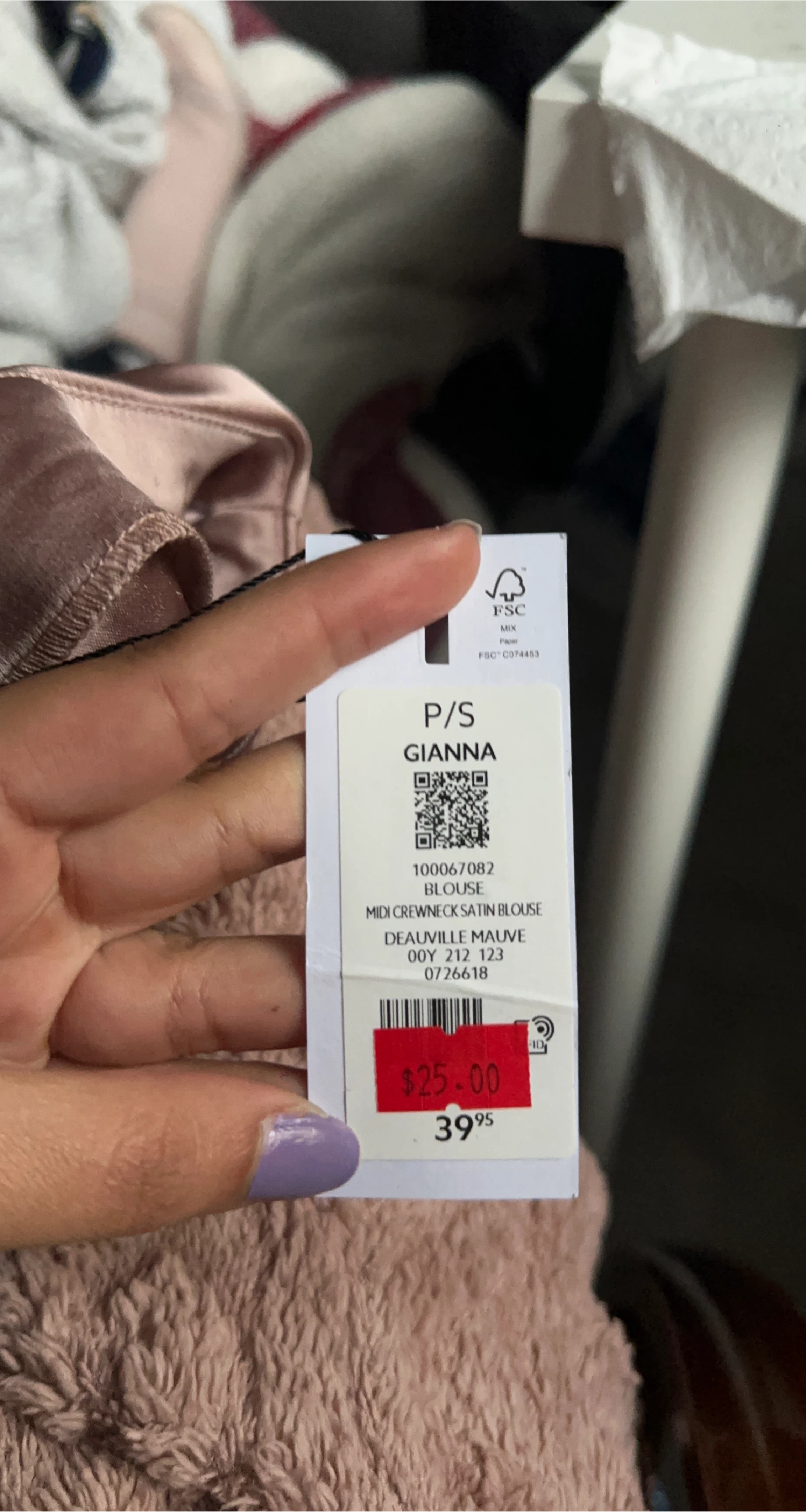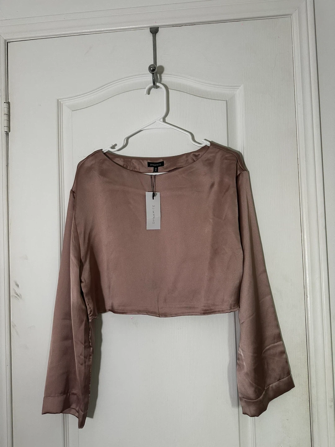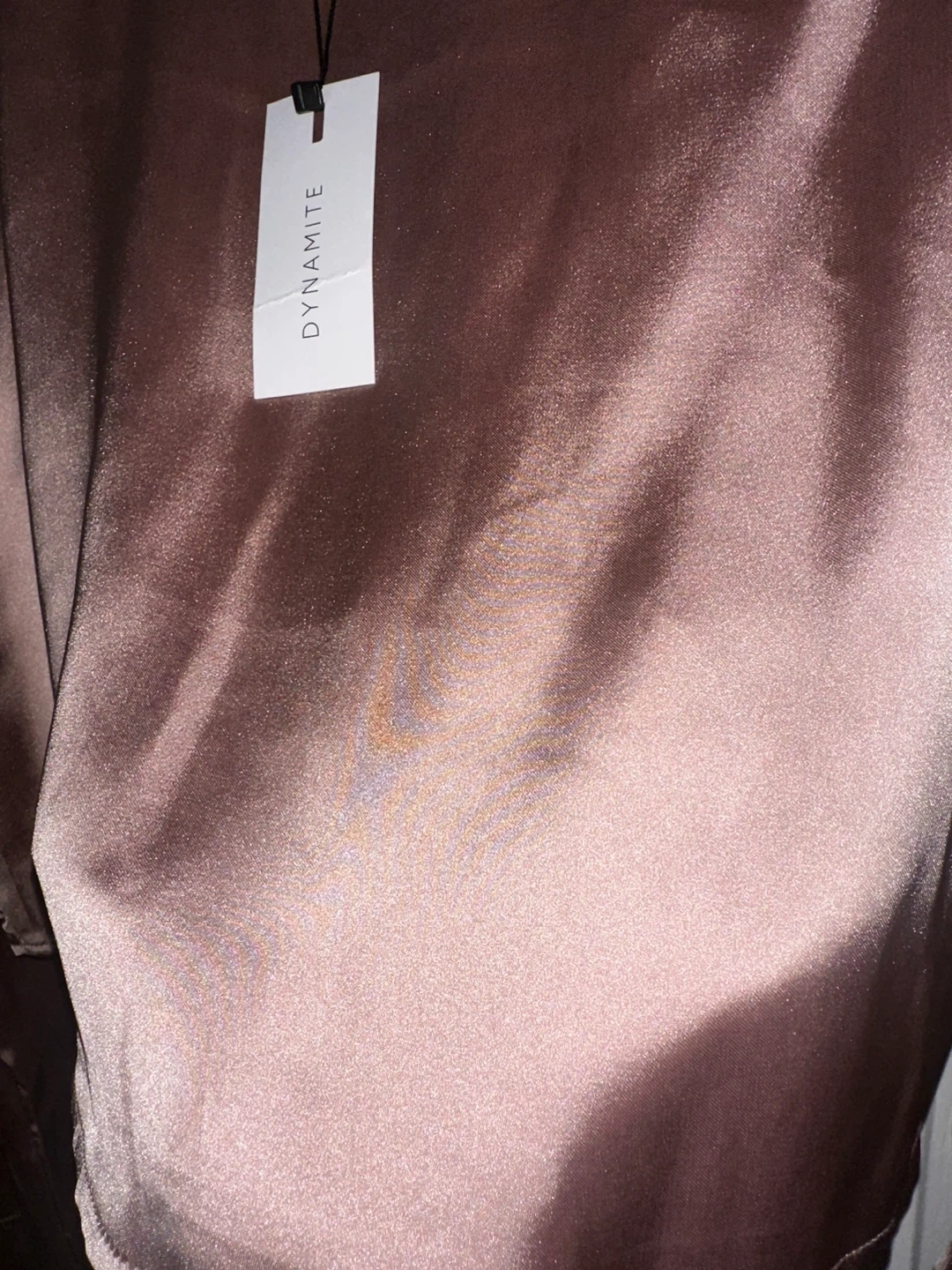 10This is a brand new Dynamite Gianna blouse in size P/S. It's a beautiful midi crew-neck satin blouse with a lovely Deauville mauve colour. Originally priced at $39.95!