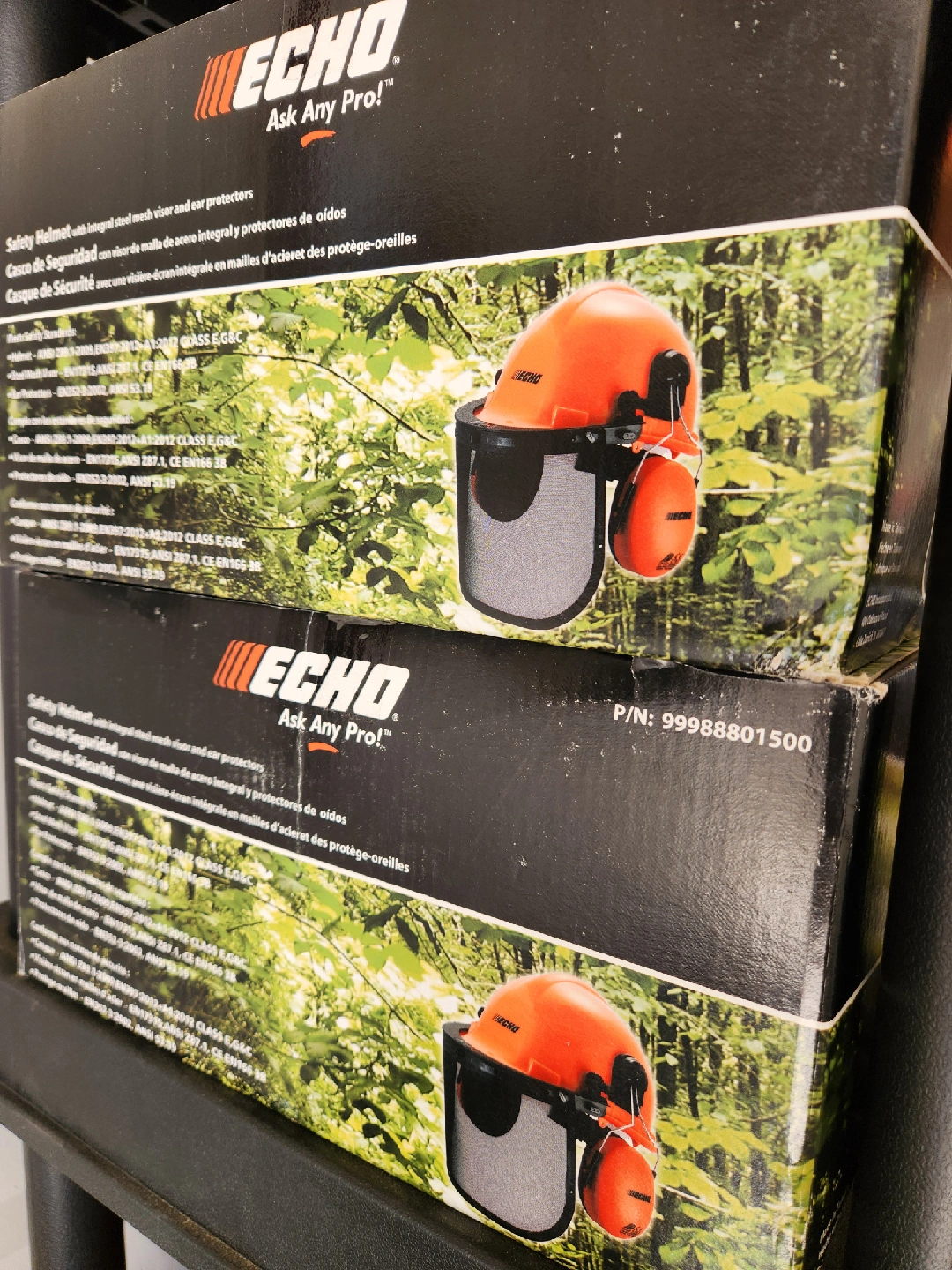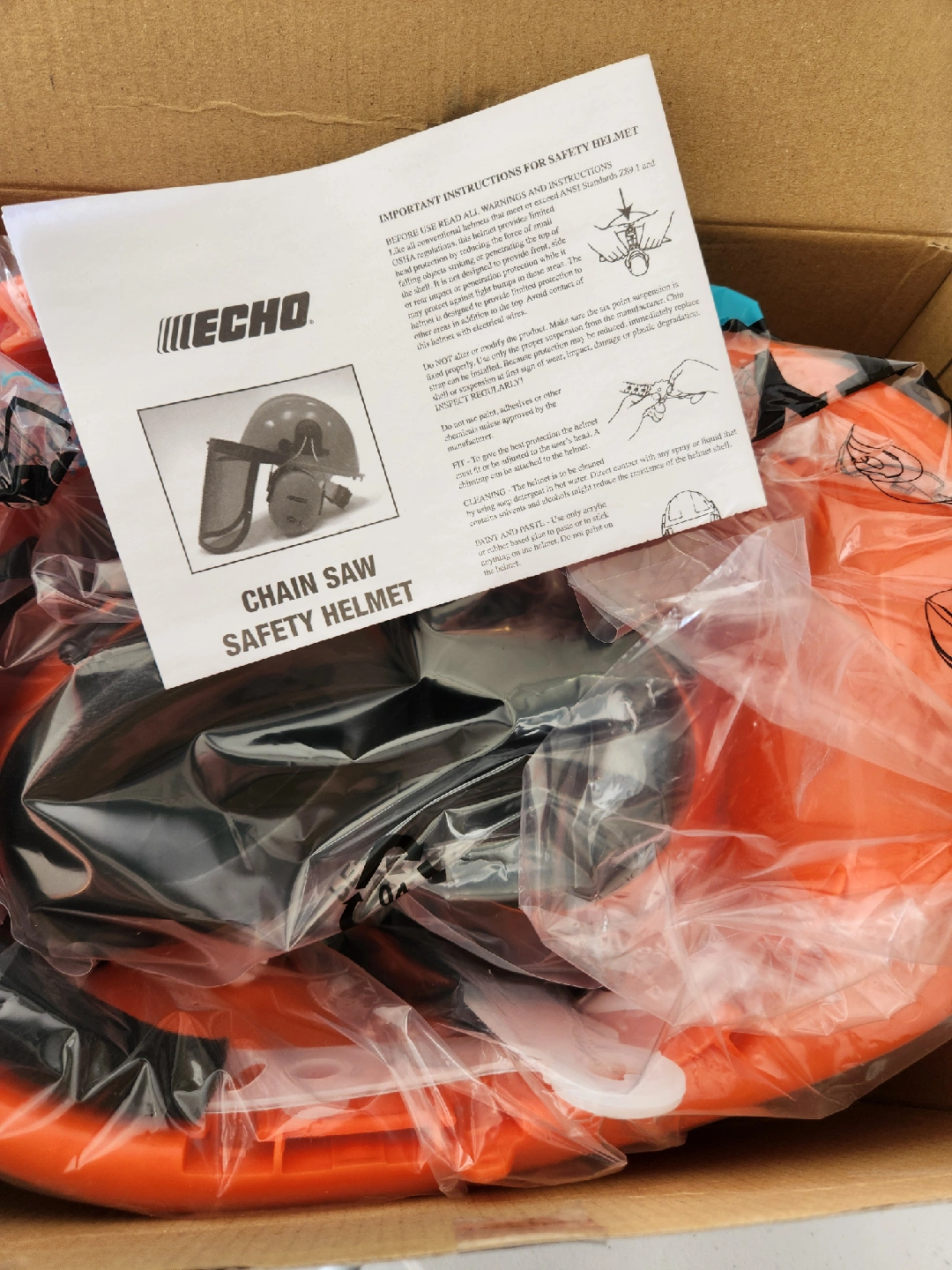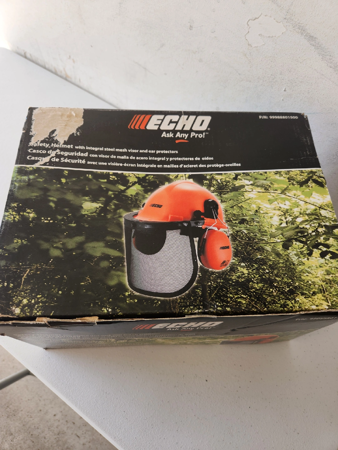 Selling a brand new Echo chainsaw safety helmet! This safety helmet comes with an integral steel mesh visor and ear protectors. It's still in its original box. Perfect for anyone needing protection while using a chainsaw or Trimmer etc.... Now on SALE while supplies Last 4 Left