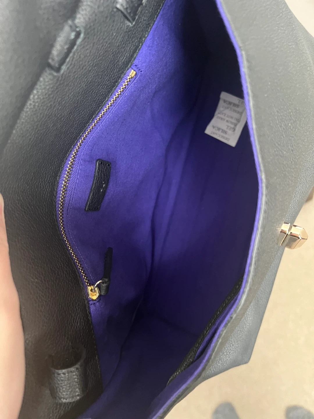 A stylish black tote bag with a striking purple interior! It comes with an additional strap, so you can wear it as a shoulder bag or crossbody. Also includes a dust bag for storage. Great for gifting
