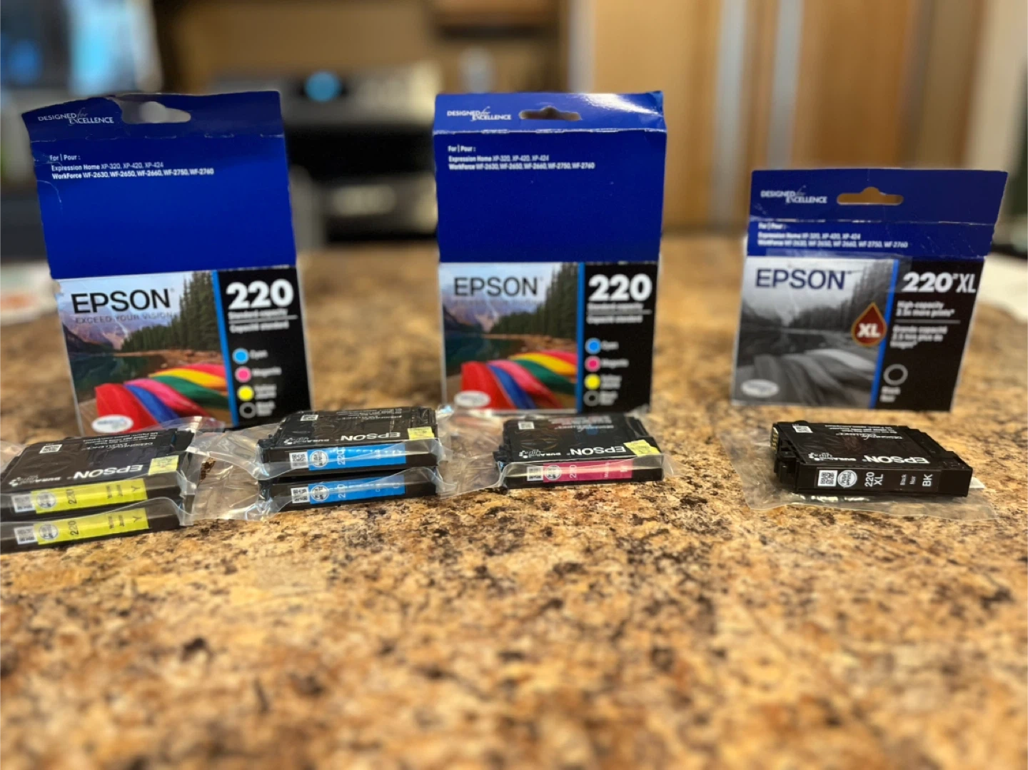 I have some brand new Epson 220 and 220XL ink cartridges for sale! These are compatible with Expression Home XP-320, XP-420, XP-424 and WorkForce WF-2630, WF-2650, WF-2660, WF-2750, WF-2760 printers Mixture of Epson 220 ink cartridges 2x yellow 2x cyan 1x magenta 1x XL black All cartridges sealed by plastic except the black which was opened for troubleshooting purposes Expiry dates: colours - Aug & November 2027, Black - March 2028 (The store price for the black alone is over $60)