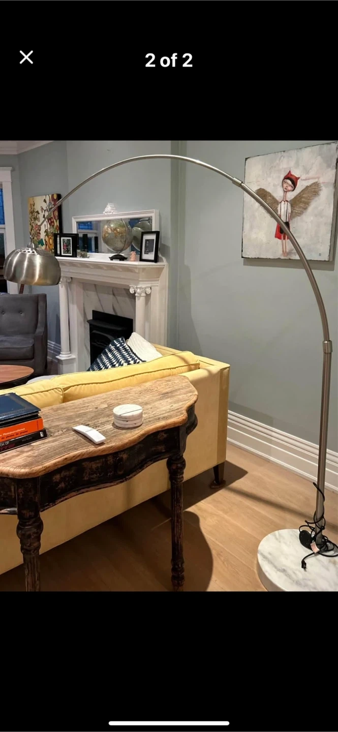 10Selling an arc floor lamp. It's in great condition and would look great in any living room or bedroom! The base is heavy marble and the shade is silver metal. Did not work in our space.