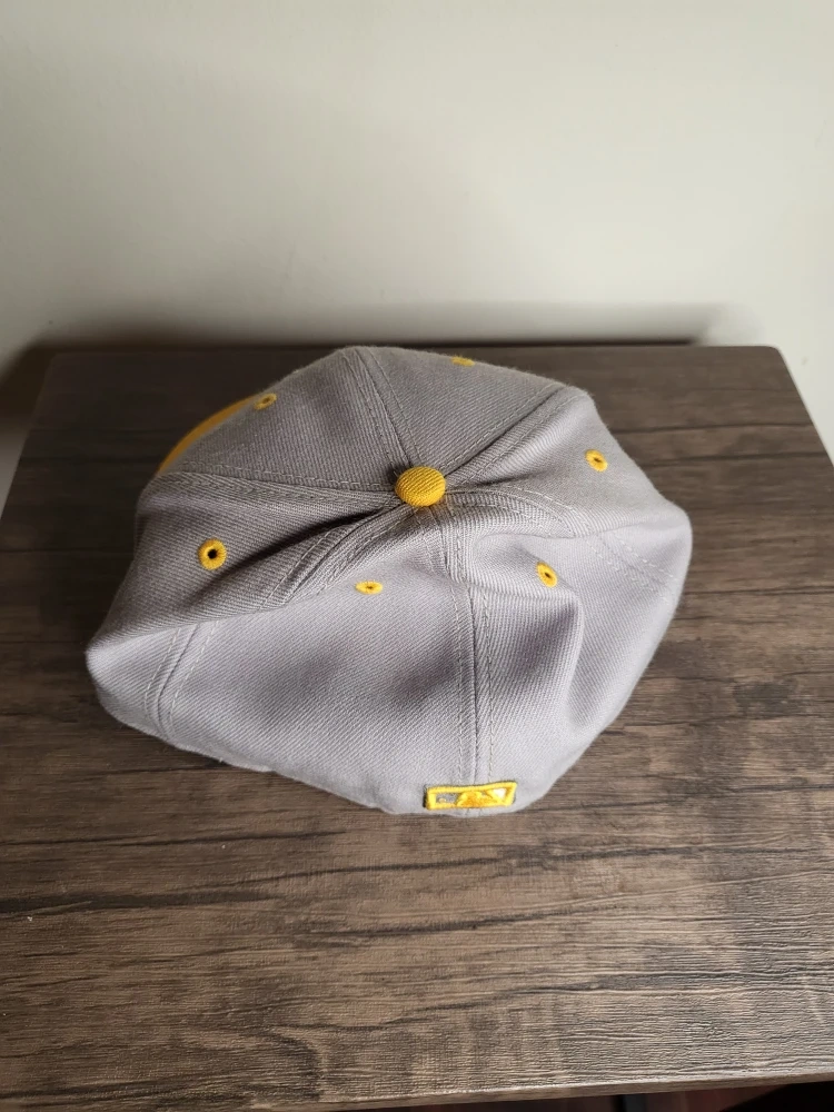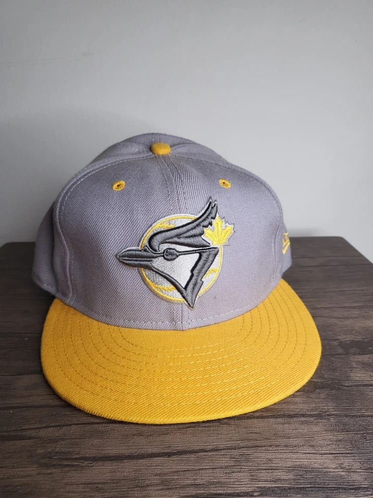 21Selling a New Era Toronto Blue Jays 59FIFTY fitted hat. It's a size 7 1/4 (57.7cm) and features a grey crown with a yellow brim. The hat is in great condition!