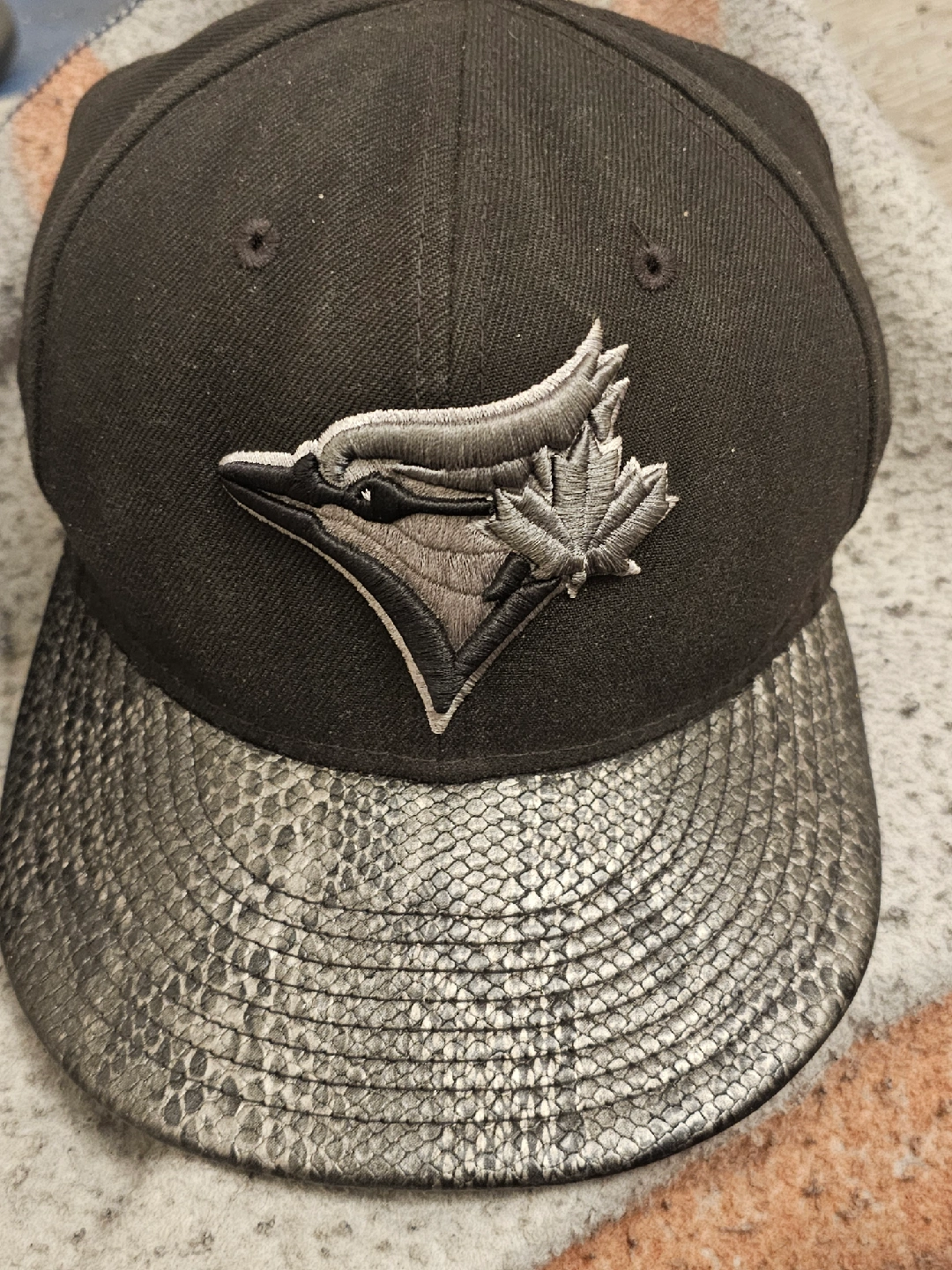 Selling a New Era Toronto Blue Jays hat in excellent condition! The size is 7 3/4. It features the Blue Jays logo with a maple leaf accent. The brim has a unique snakeskin-like texture, adding a stylish touch to this classic baseball cap