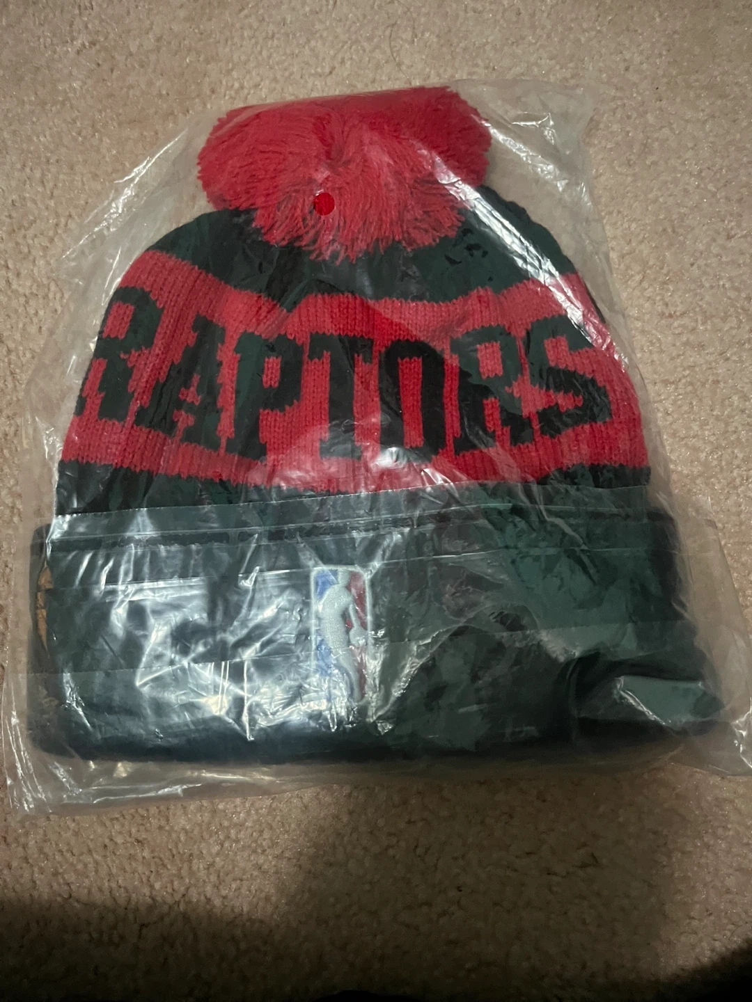 I'm selling a brand new Toronto Raptors NBA beanie from New Era! It's red and black with the Raptors logo, and it still has the original packaging