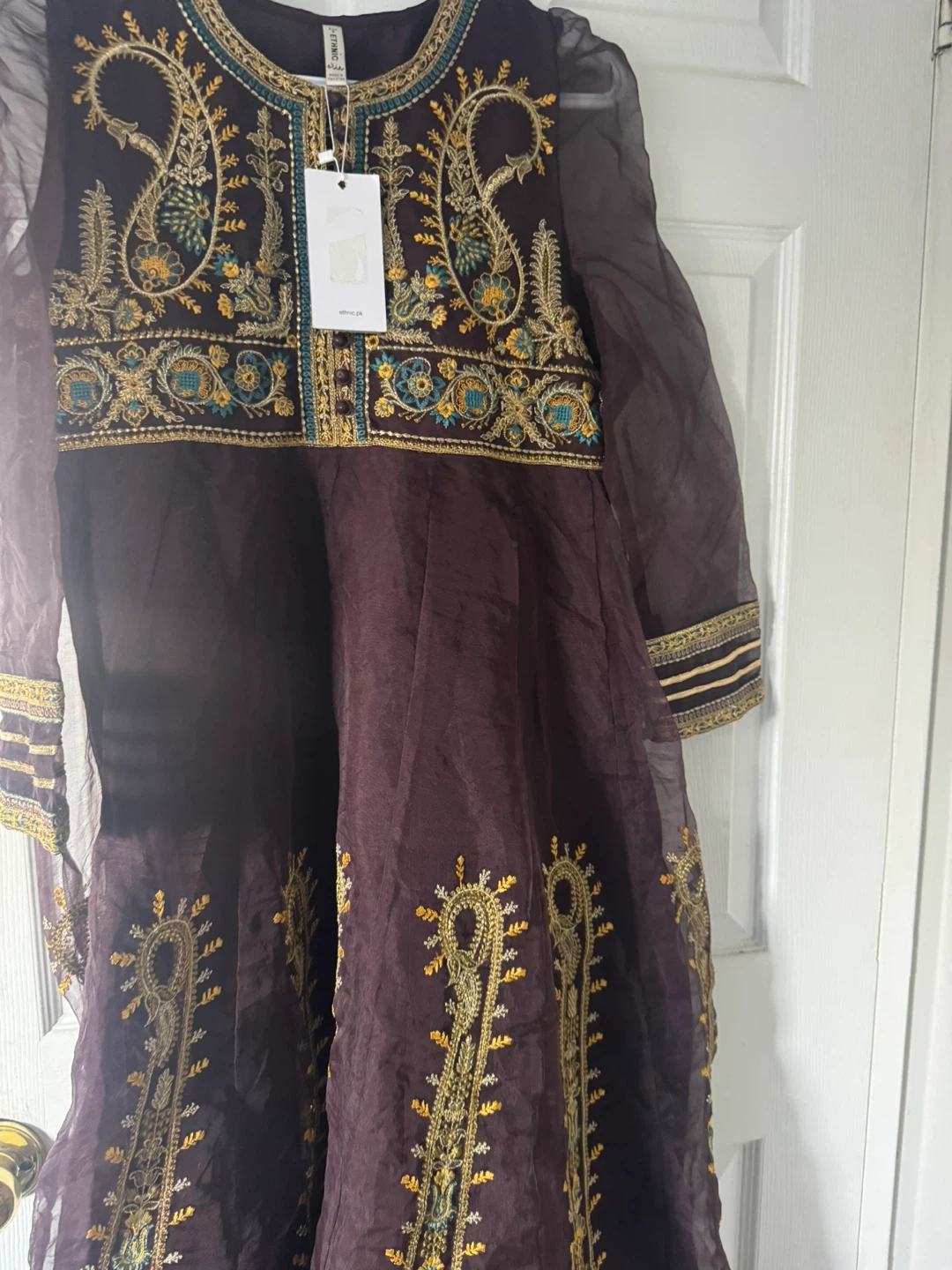 109Beautiful embroidered dress flair dress from Ethnic by Outfitters. It features intricate gold and teal embroidery on a sheer, dark purple fabric. Perfect for a special occasion or adding a touch of elegance to your wardrobe!New With Tag