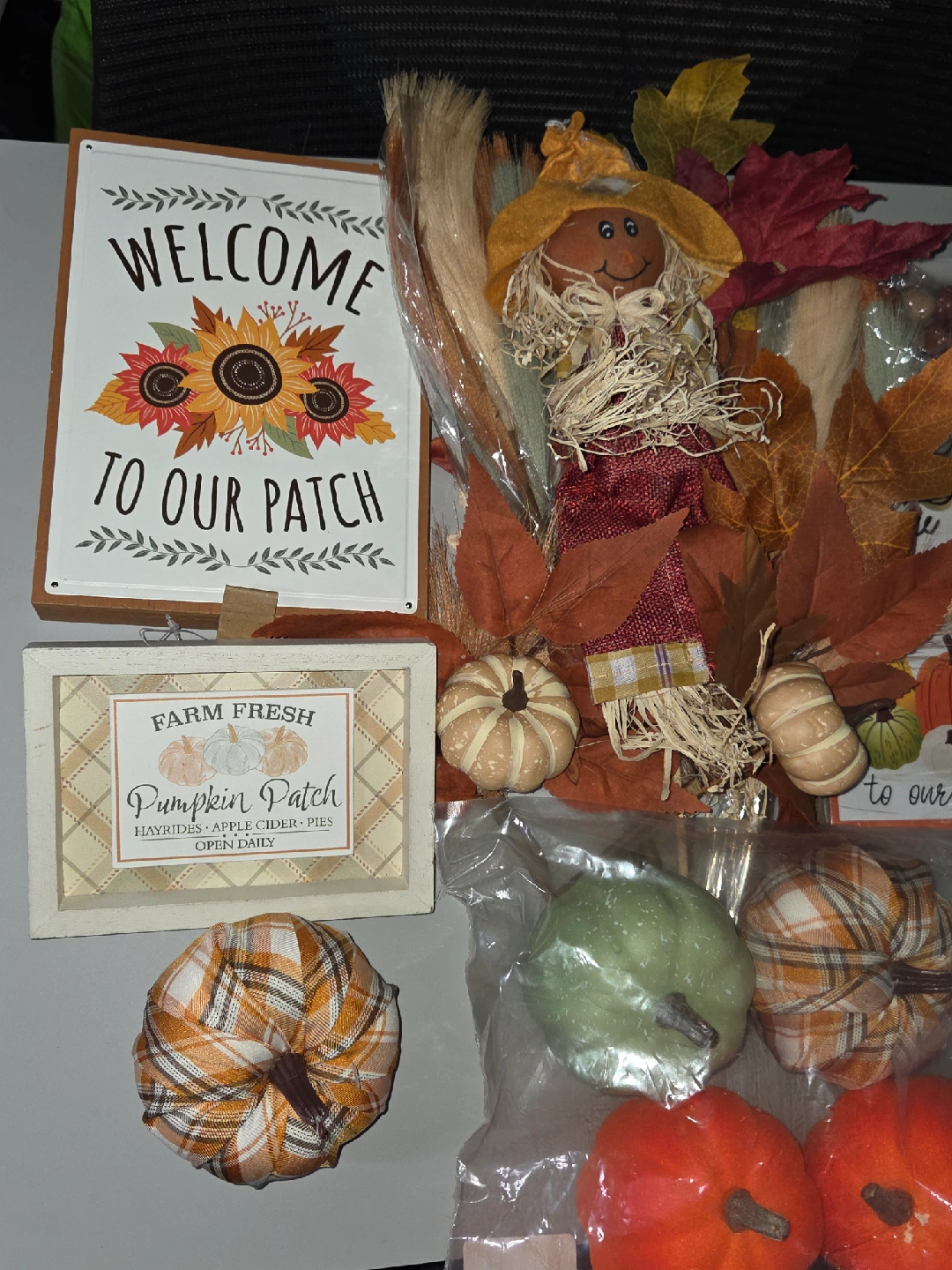 60Fall & Thanksgiving decor bundle, all new and ready to bring some autumn cheer to your home! Includes signs with cute sayings like "Oh My Gourd you're here!" and "Welcome to our patch", plus decorative pumpkins, gourds, leaves, and a charming scarecrow. Perfect for adding a festive touch to any room!