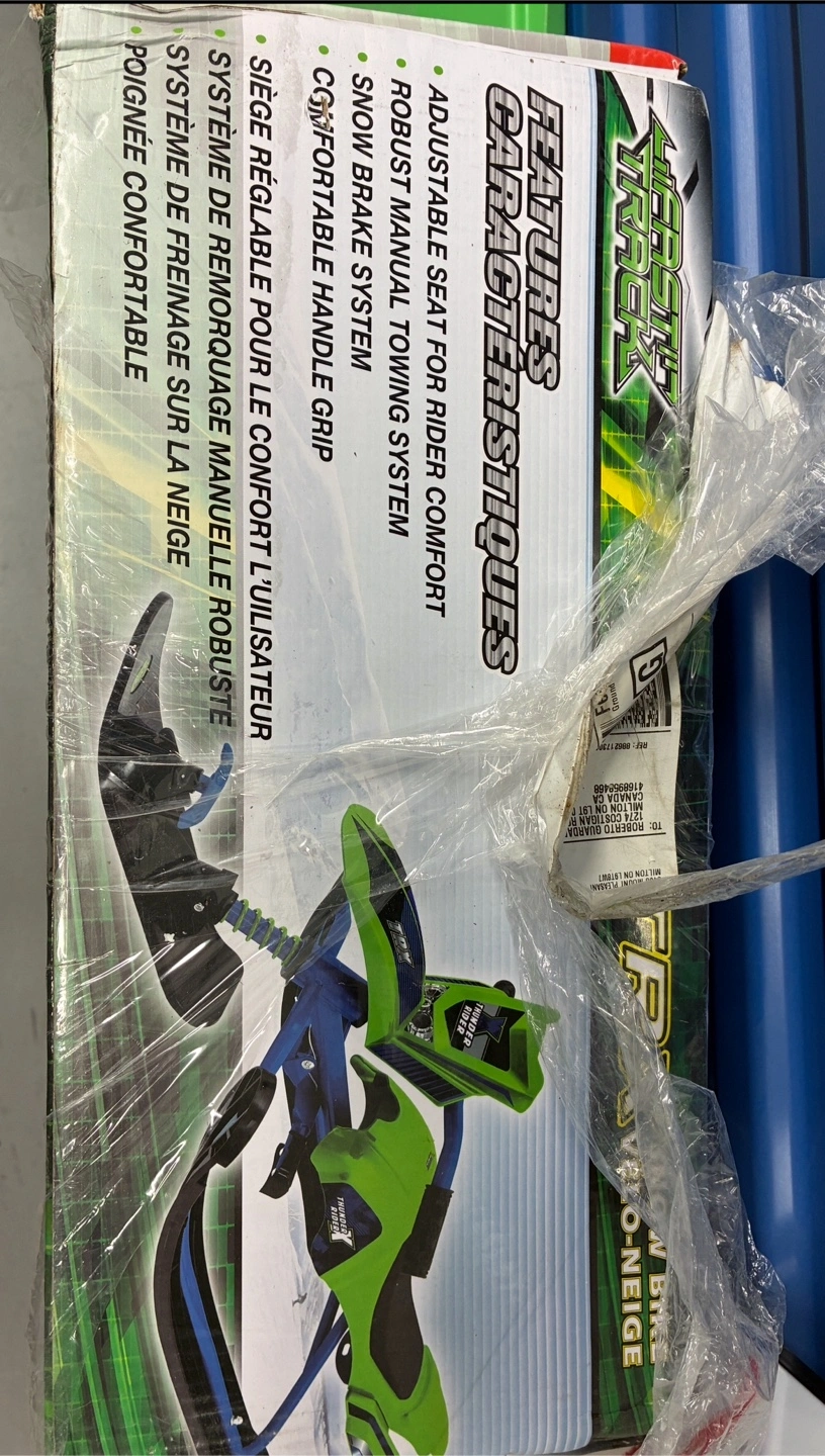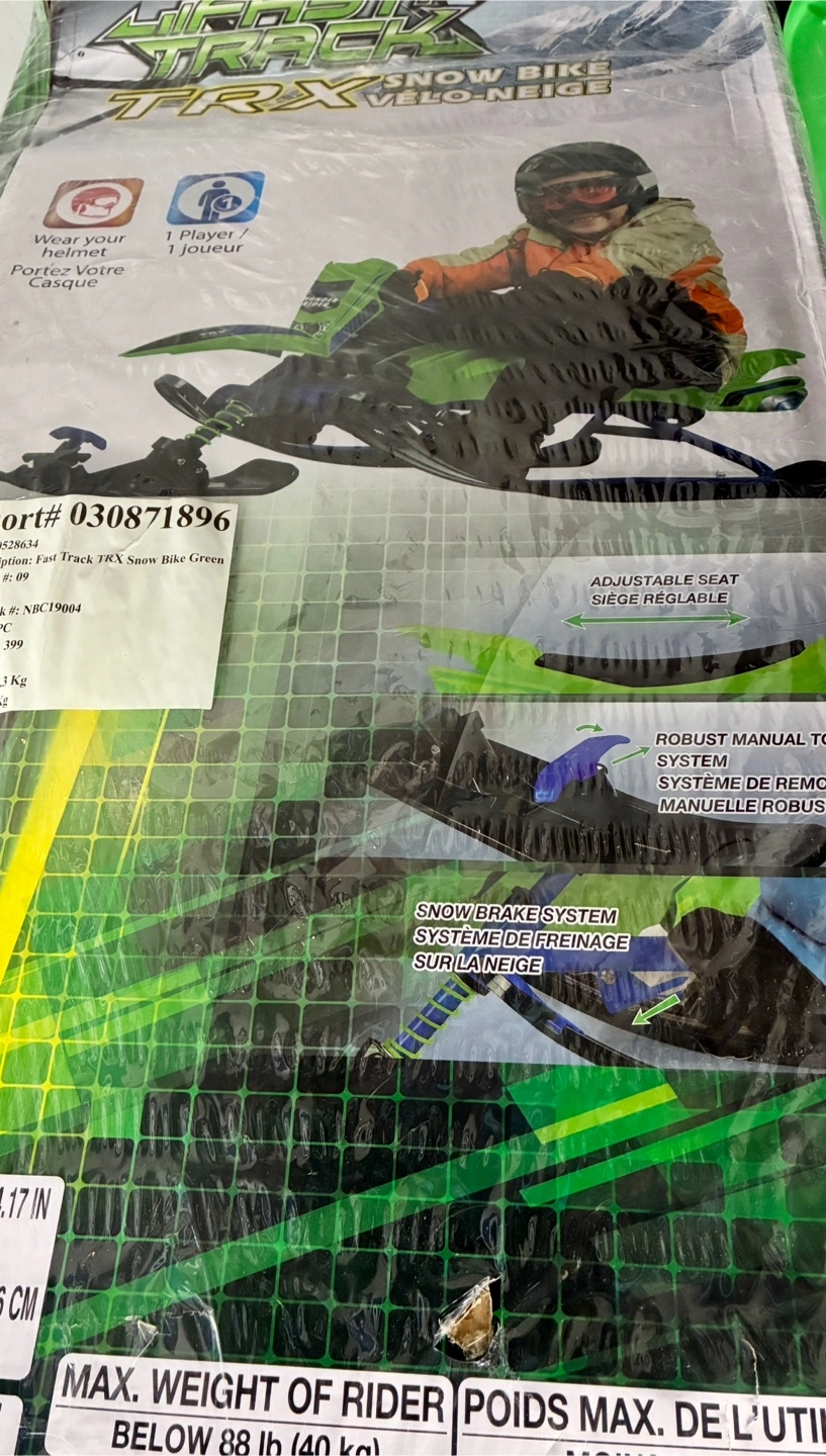 Selling a brand new Fast Track TRX Snow Bike in green! It features an adjustable seat for rider comfort and a robust manual towing system. It also has a snow brake system and a comfortable handle grip. Maximum weight of rider is 88 lb (40 kg)