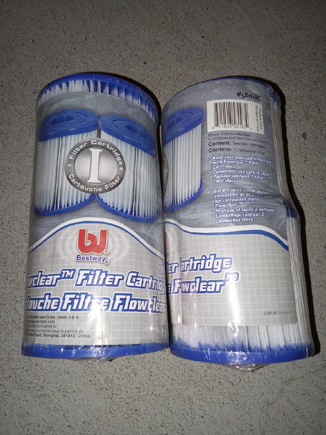 126Selling a brand new two-pack of Bestway Flowclear filter cartridges! These are #58168C. They help keep your pool sparkling clean and are convenient and easy to clean. Each package contains two filter cartridges