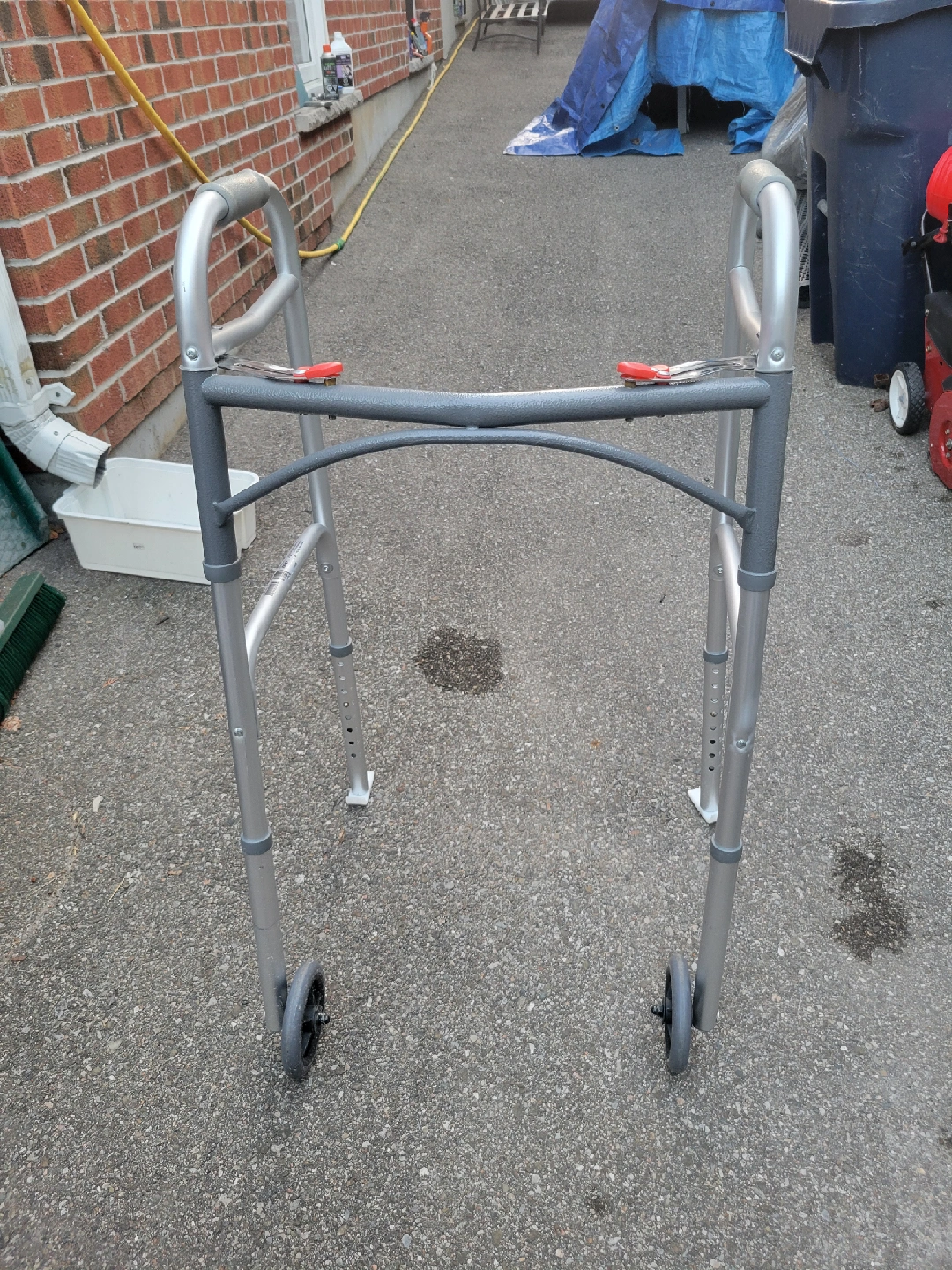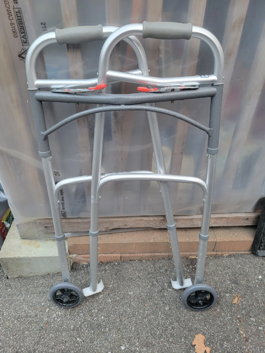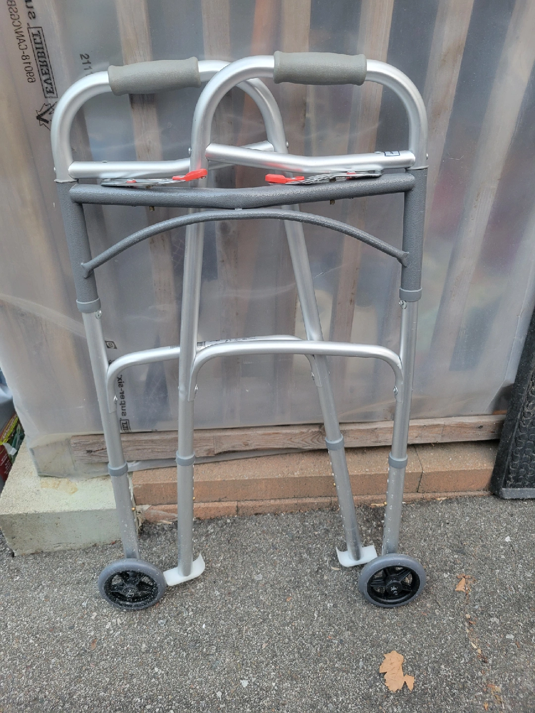 Brand new folding walker with wheels. Folds up easily for storage or transport