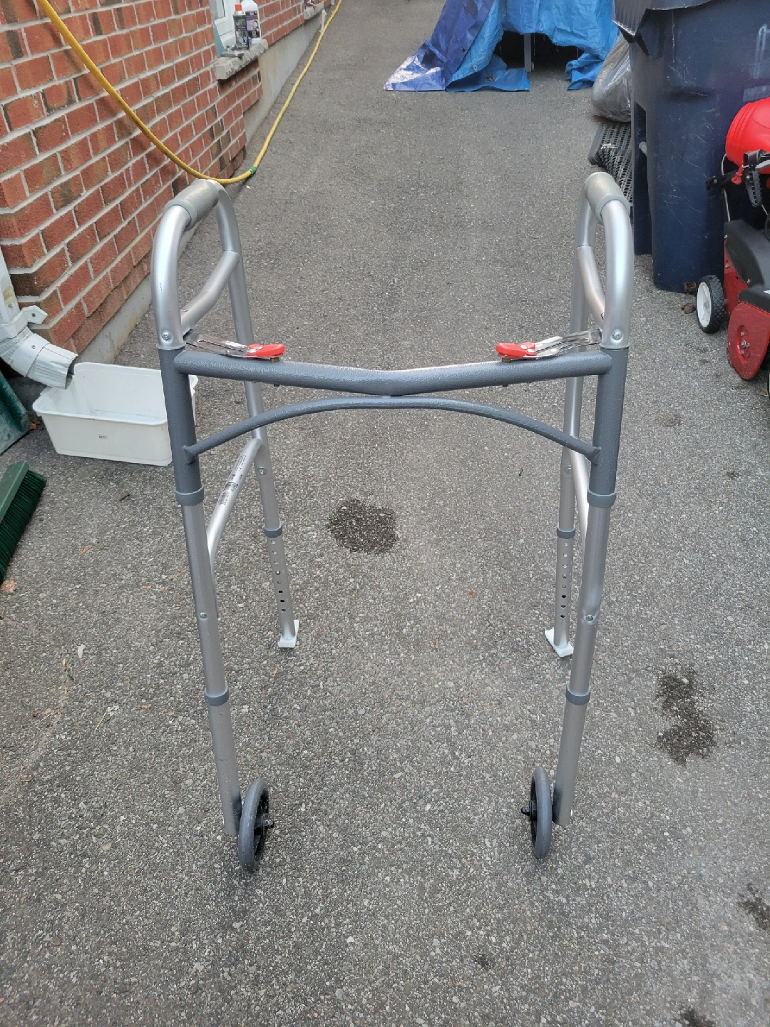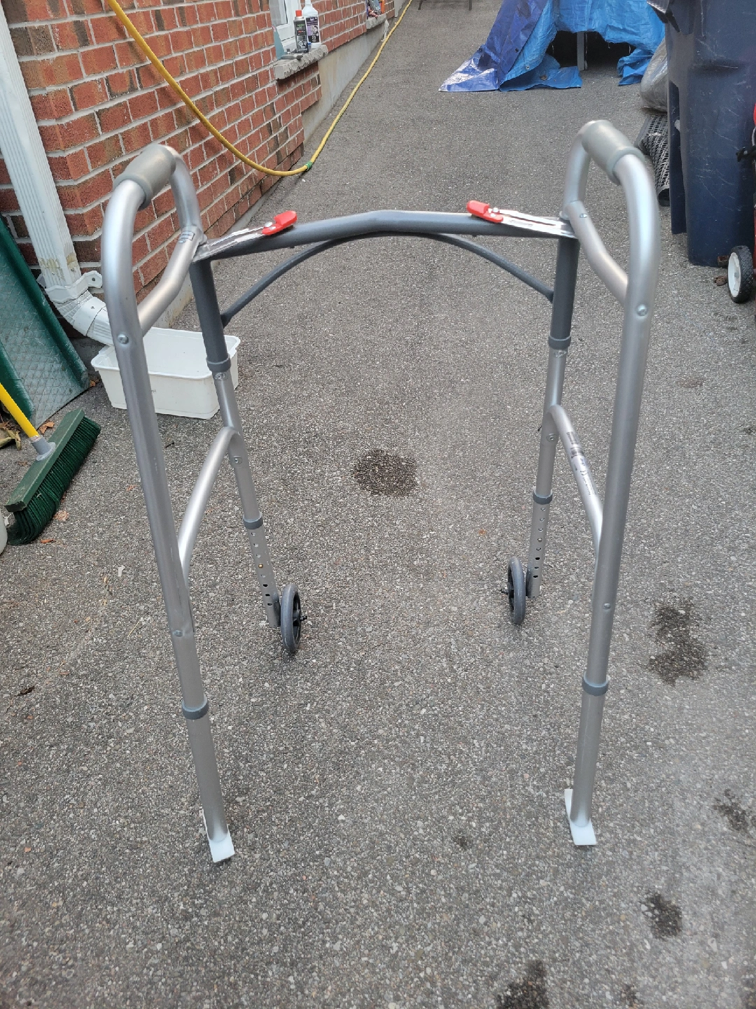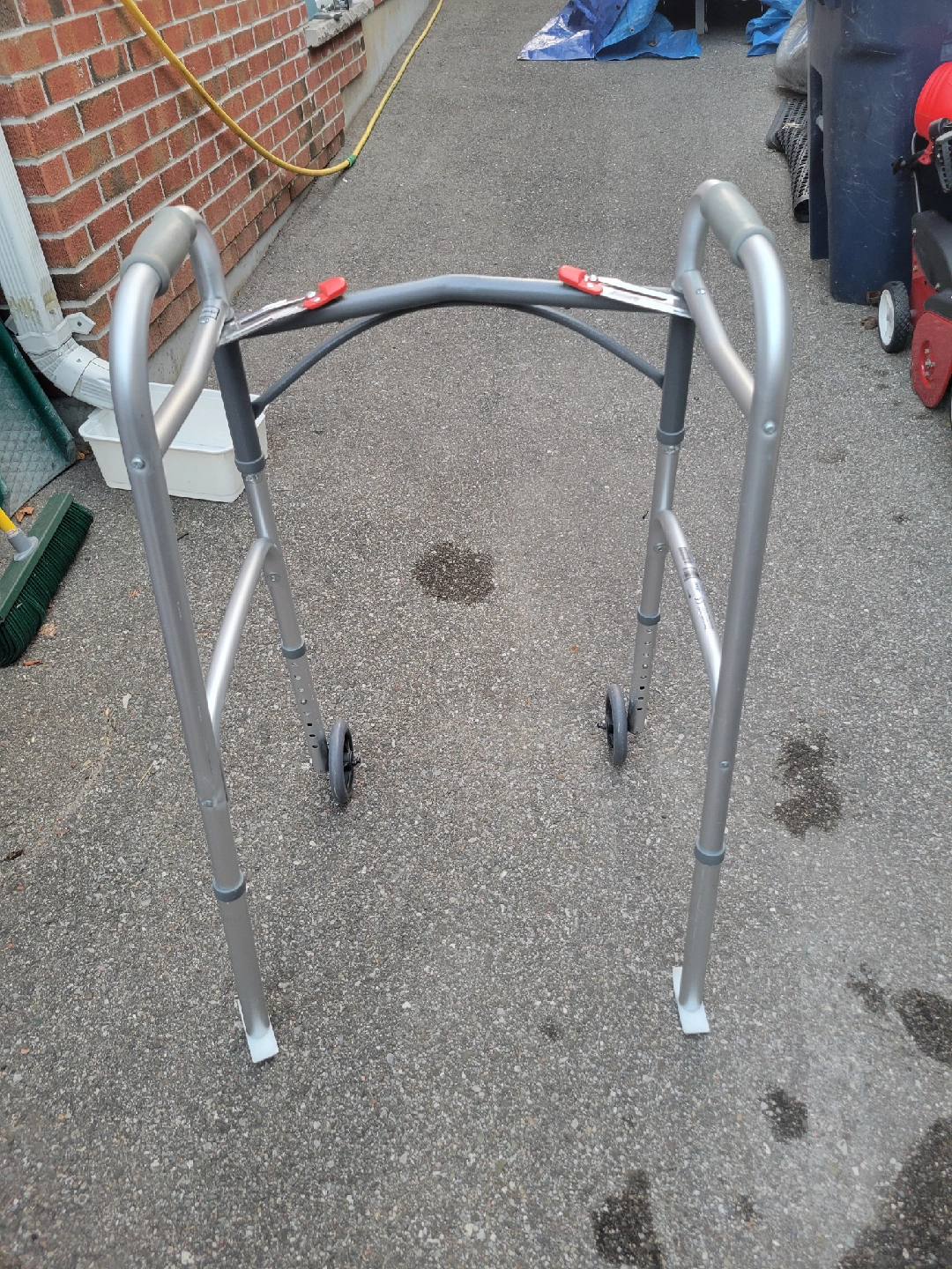 Brand new folding walker with wheels. Folds up easily for storage or transport
