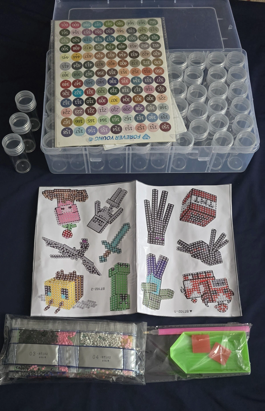 Get creative with this Forever Young diamond kit! It's perfect for crafters who love Minecraft. The kit includes everything you need to create your own sparkling artwork: a variety of colourful diamonds, tools, and featuring fun Minecraft designs. It also comes with a handy storage case to keep everything organized. A fun project for any age!