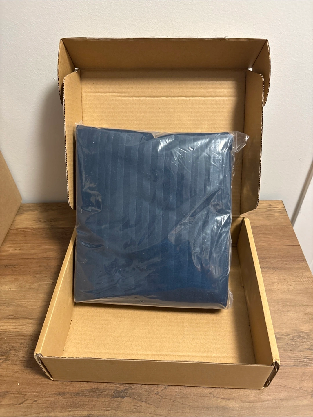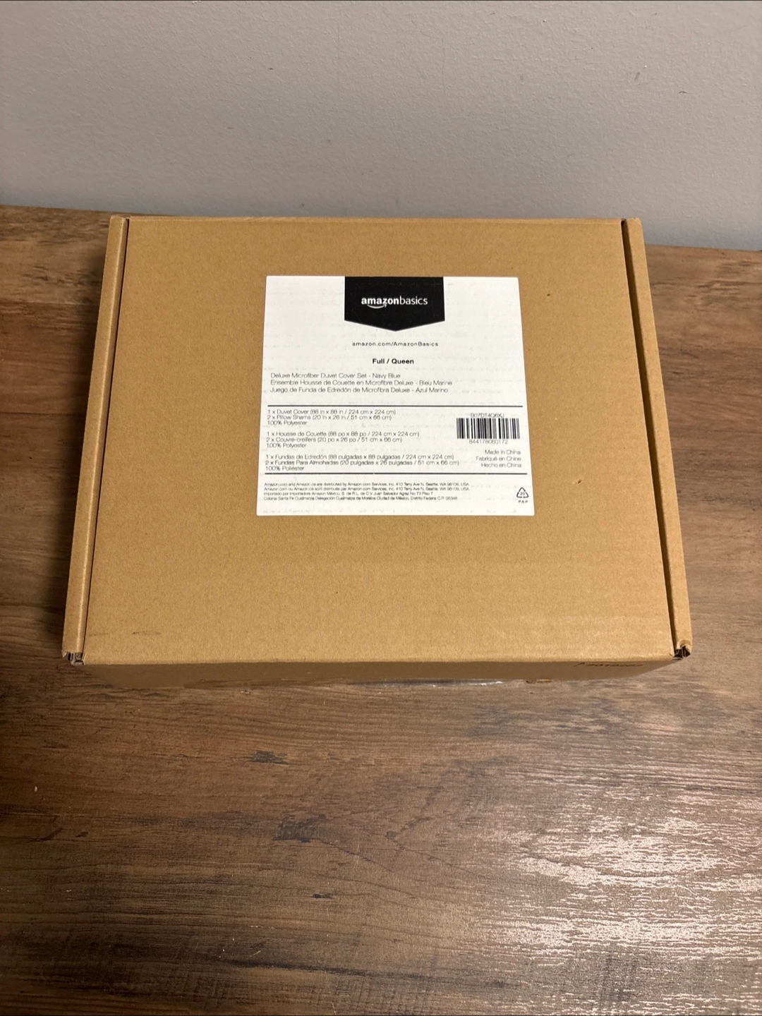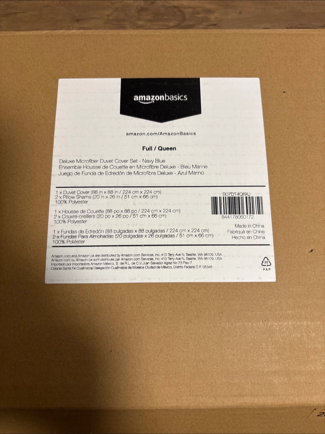 This is an AmazonBasics Deluxe Microfiber Duvet Cover Set in Navy Blue, size Full/Queen. The set includes: - 1 Duvet Cover (88 in x 88 in / 224 cm x 224 cm) - 2 Pillow Shams (20 in x 26 in / 51 cm x 66 cm) It's made of 100% Polyester and comes in its original box