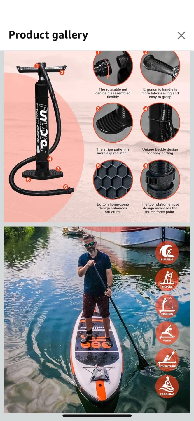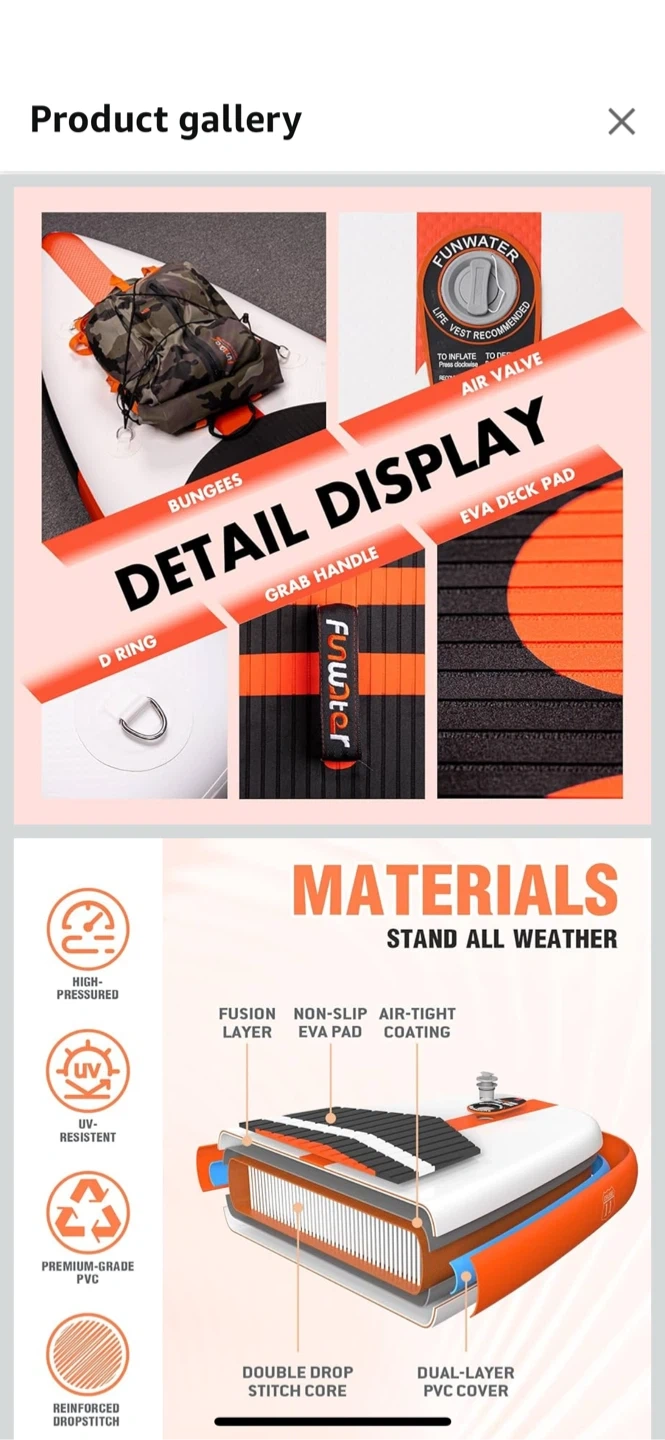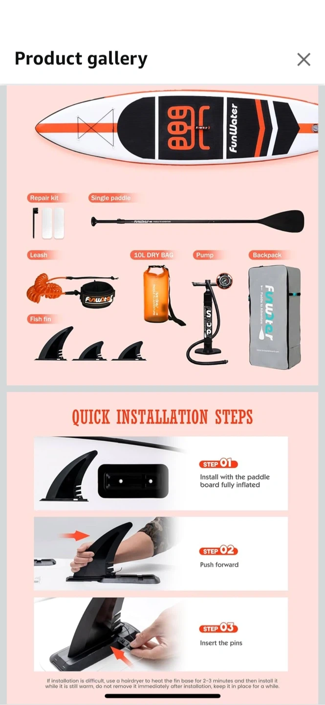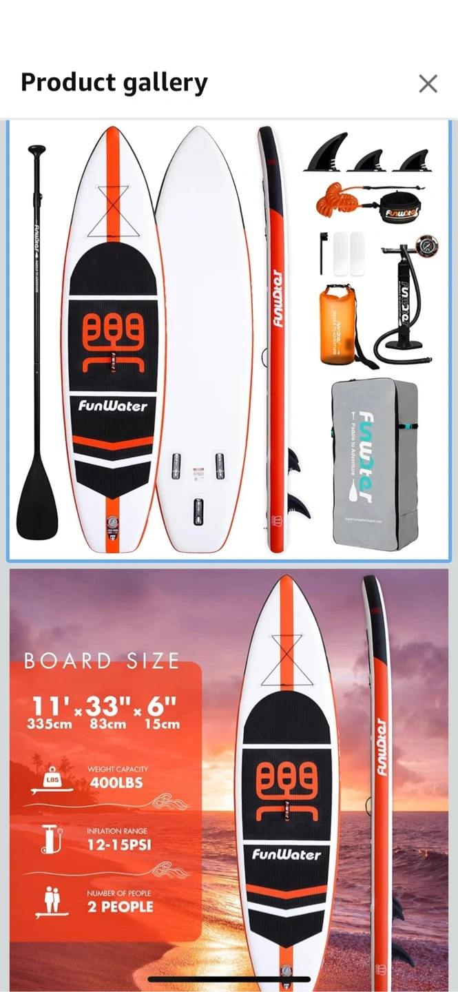 Amazon Price $199 Get ready for some fun on the water with this inflatable stand-up paddleboard! It's a FunWater board, measuring 11' x 33" x 6". It comes with everything you need to get started, including a pump, paddle, repair kit, leash, fins, and a backpack for easy transport. The board is made with high-pressure, UV-resistant, premium-grade PVC with reinforced dropstitch. Perfect for surfing, fishing, travel, yoga, adventure, and paddling!