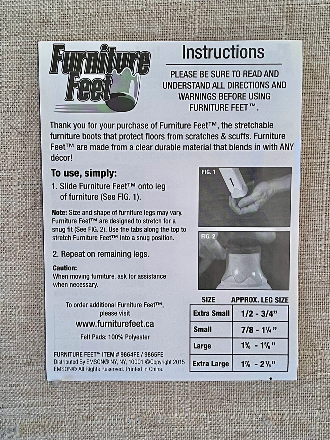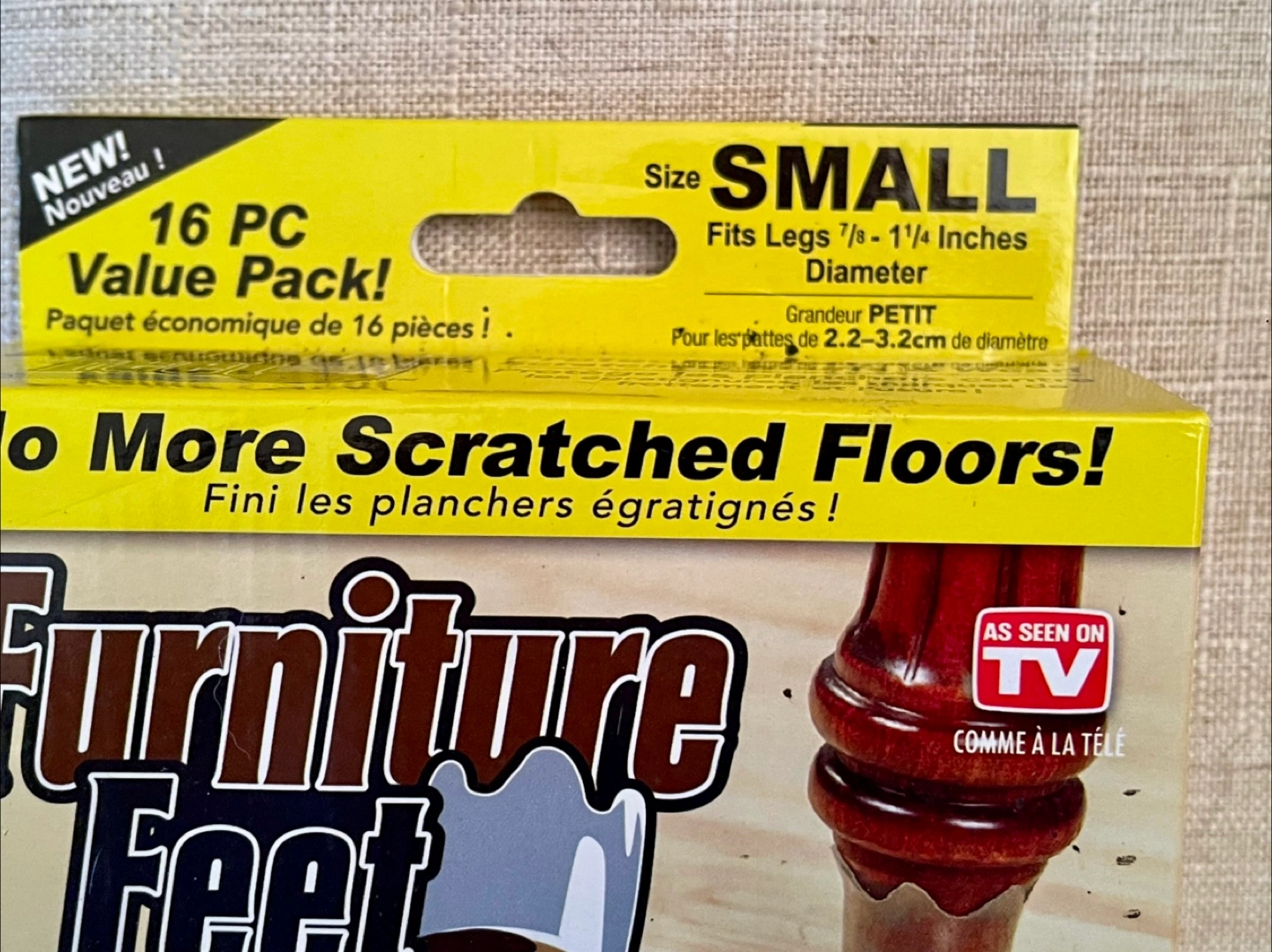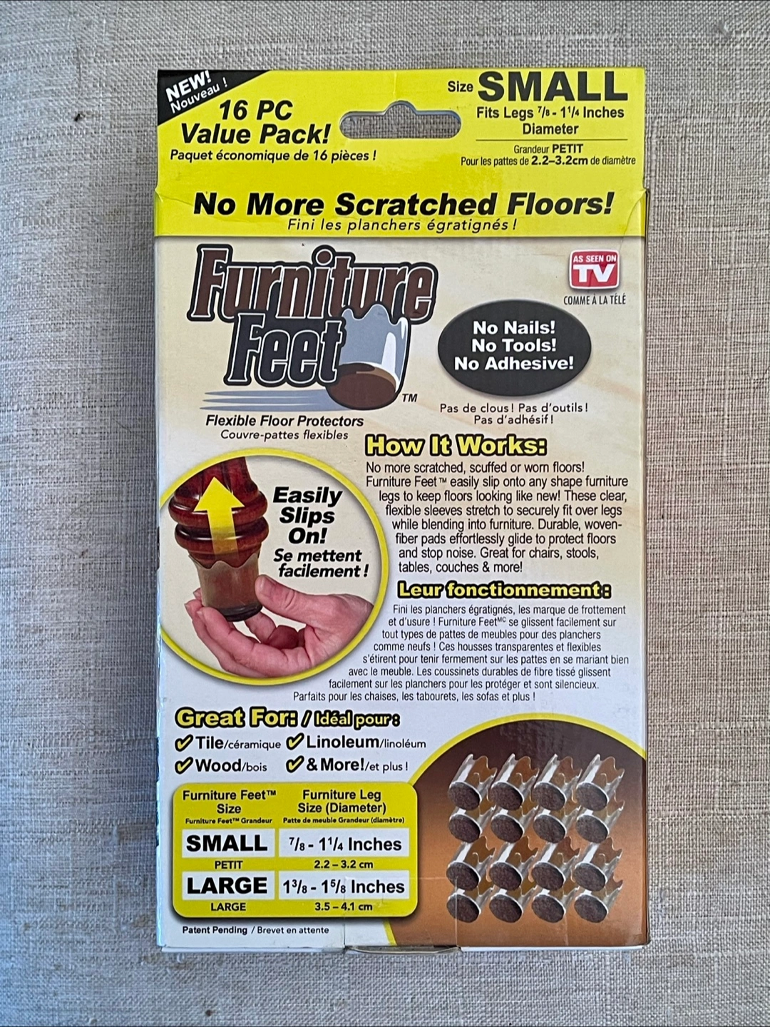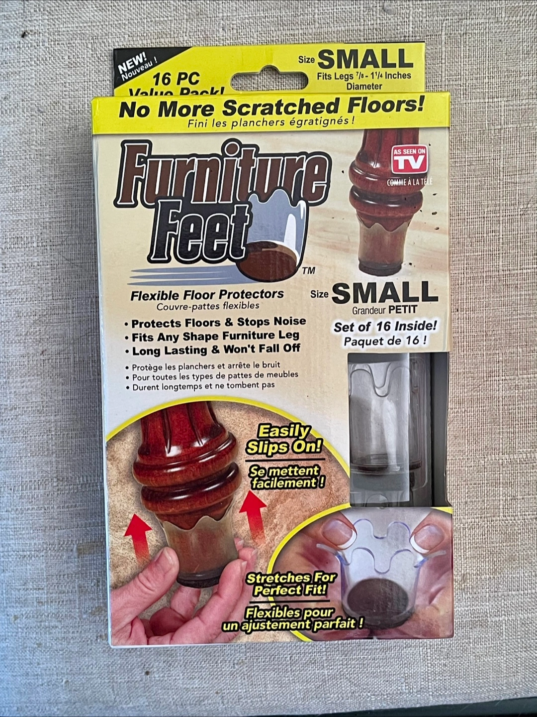 Keep your floors scratch-free with these Furniture Feet flexible floor protectors! This is a 16-piece value pack in size small, designed to fit legs 7/8 - 1 1/4 inches in diameter. They're easy to slip on and stretch for a perfect fit, protecting your floors and stopping noise from furniture legs. Great for tile, linoleum, wood, and more!